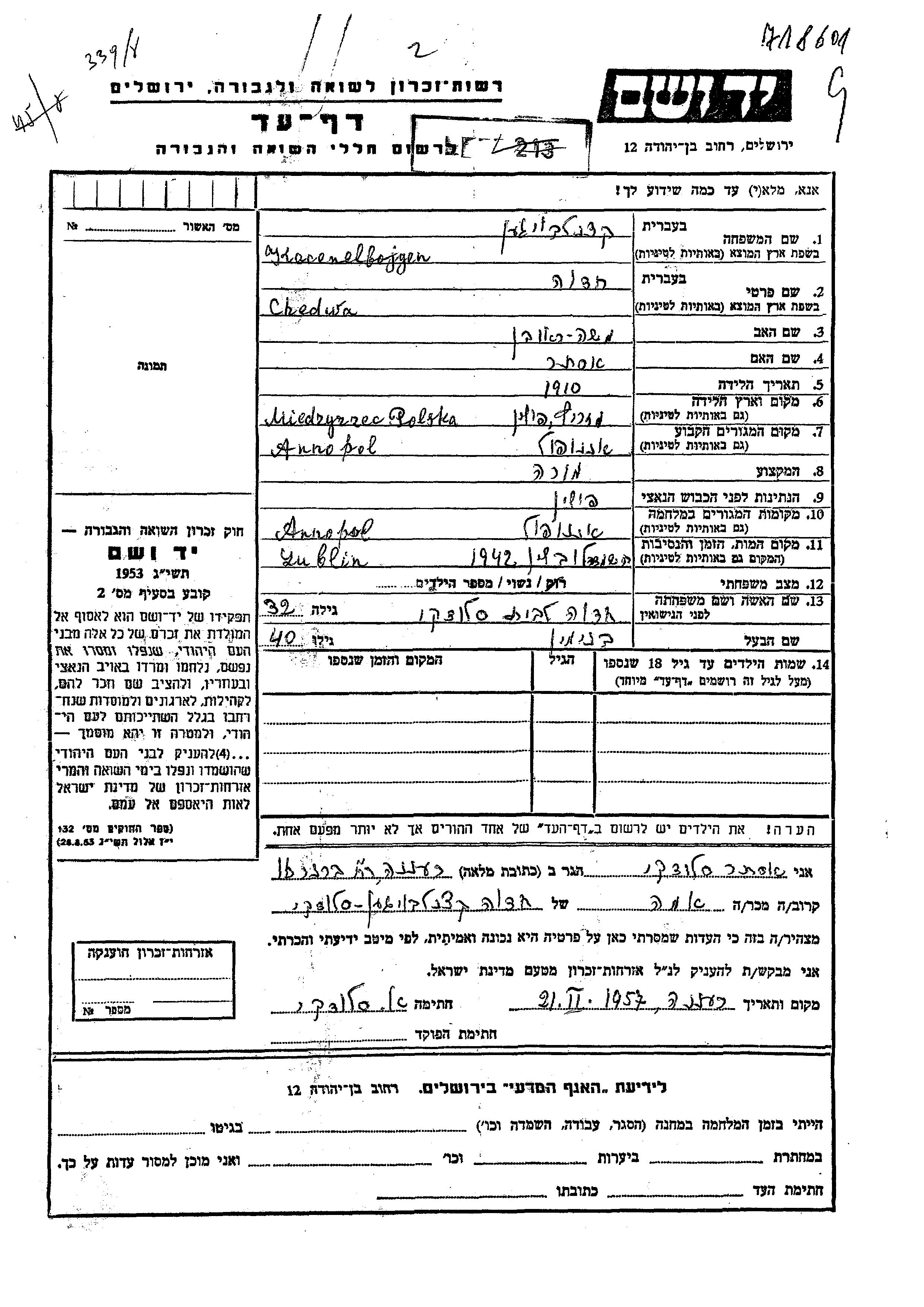 Freidel Chedwa Katznelboigen, geb. Slutzki wurde im Jahr 1910 in Miedzyrzec Podlaski, Polen geboren.