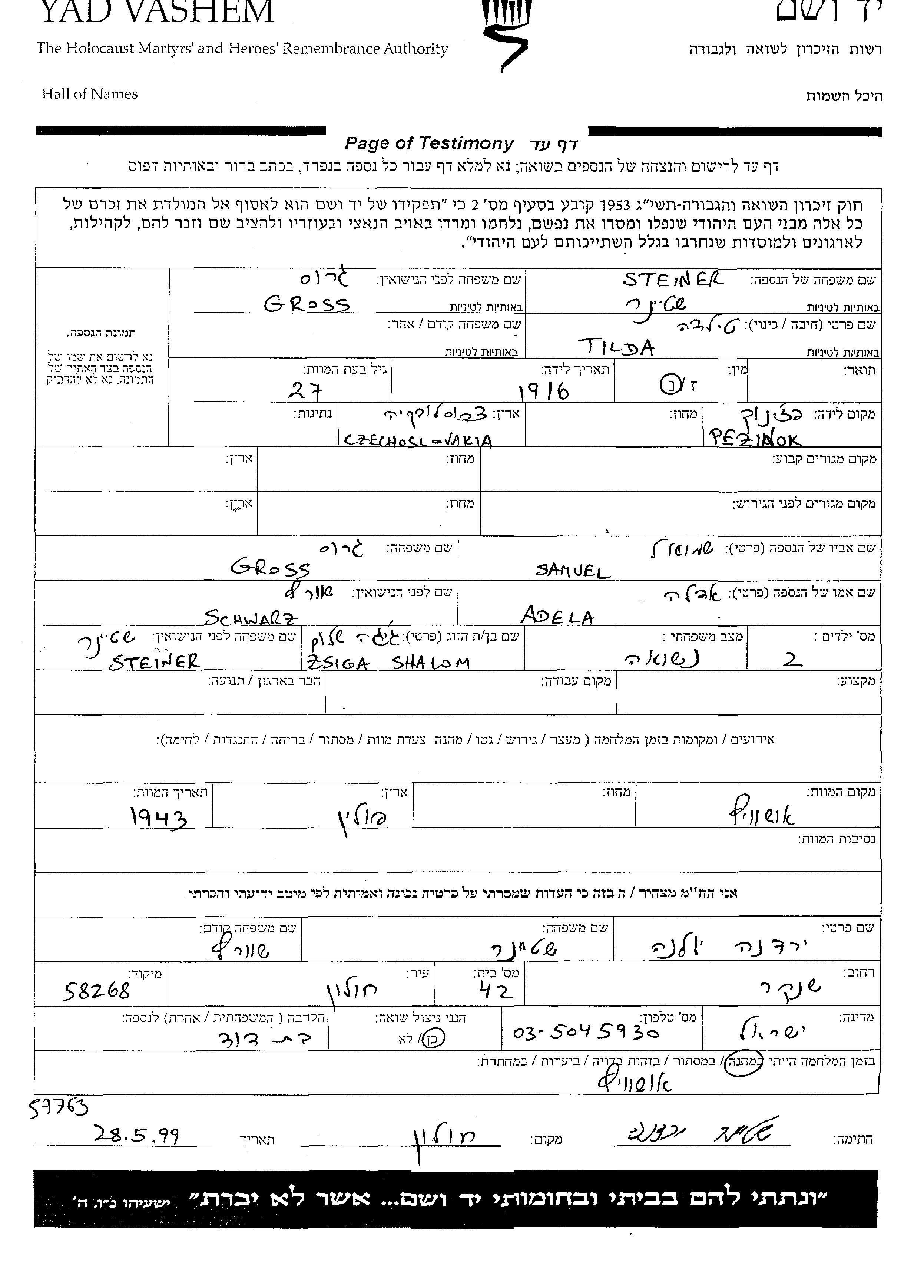 Mathilda Steiner, geb. Gross wurde im Jahr 1916 in Slovakia, Tschechoslowakei geboren. Sie war Hausfrau. Vor dem Zweiten Weltkrieg lebte sie in Dunajska Streda, Tschechoslowakei.