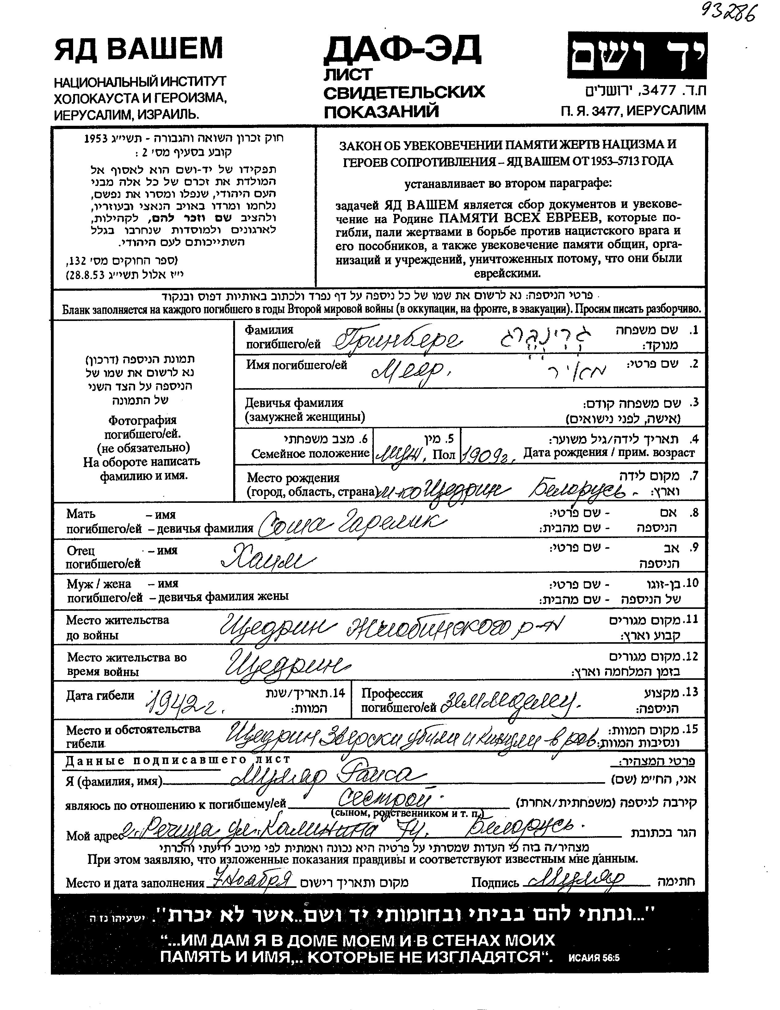 Meyer Grinberg wurde im Jahr 1909 in Shchedrin, Weißrussland (UdSSR) geboren. Er war der Sohn von Khaim und Sasha, geb. Gorelik. Er war Landwirt. Vor dem Zweiten Weltkrieg lebte er in Shchedrin, Weißrussland (UdSSR). Während des Krieges war er in Shchedrin, Weißrussland (UdSSR).