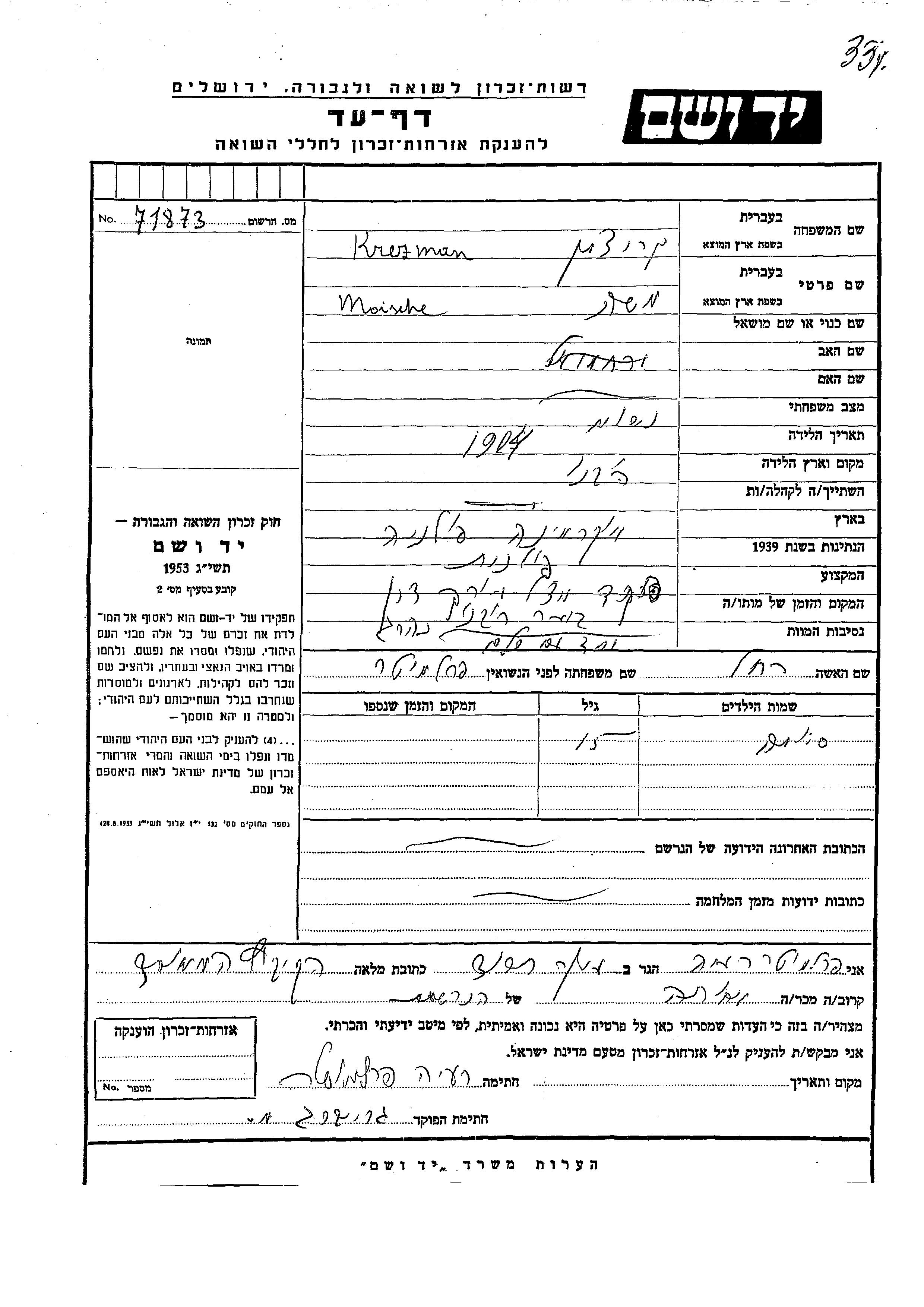 Mosha Krizman wurde im Jahr 1904 in Rowne, Polen geboren. Er war der Sohn von Yerakhmiel. Er war Angestellte/-r und mit Rakhel, geb. Perlmuter Verheiratet. Vor dem Zweiten Weltkrieg lebte er in Rowne, Polen. Während des Krieges war er in Rowne, Polen.
