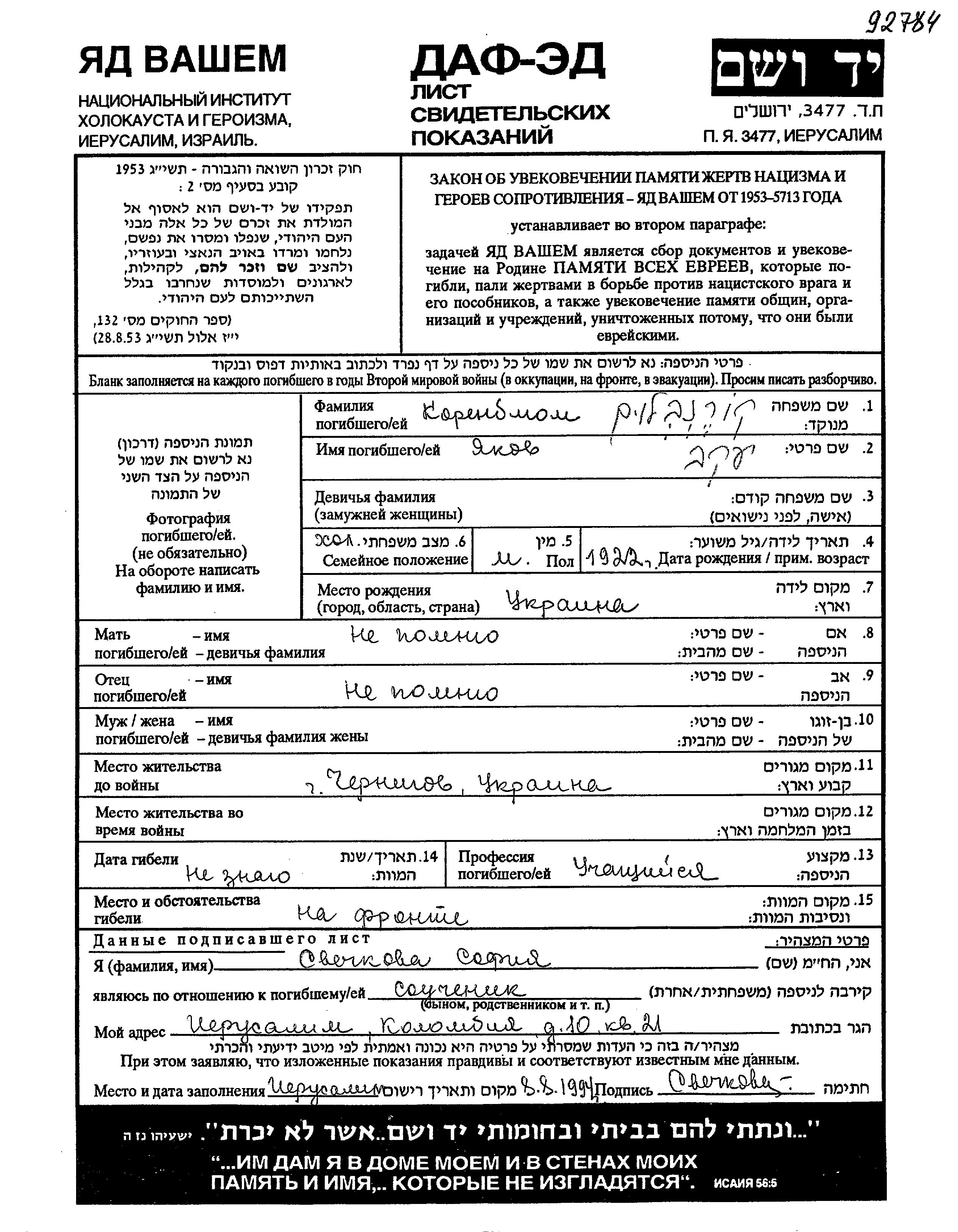 Yakov Korenblyum wurde im Jahr 1922 in Ukraine (UdSSR) geboren. Er war Schüler/-in und Ledig. Vor dem Zweiten Weltkrieg lebte er in Chernigov, Ukraine (UdSSR). Während des Krieges war er in die Sowjetischen Streitkräfte. Yakov im Militärdienst umgekommen.