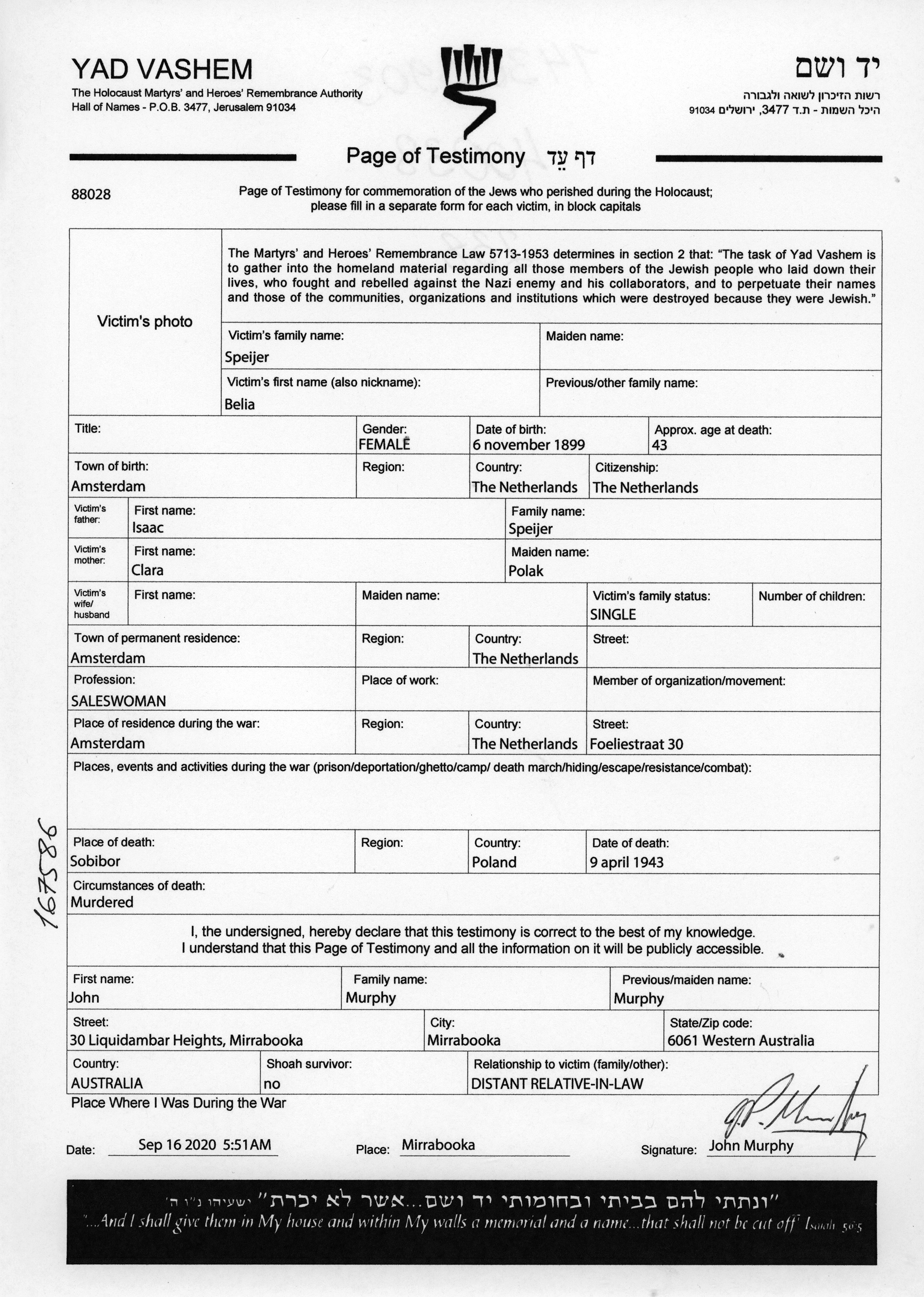Belia wurde in der Schoah ermordet. Todesort: Sobibor, Polen im Jahr 09/04/1943.