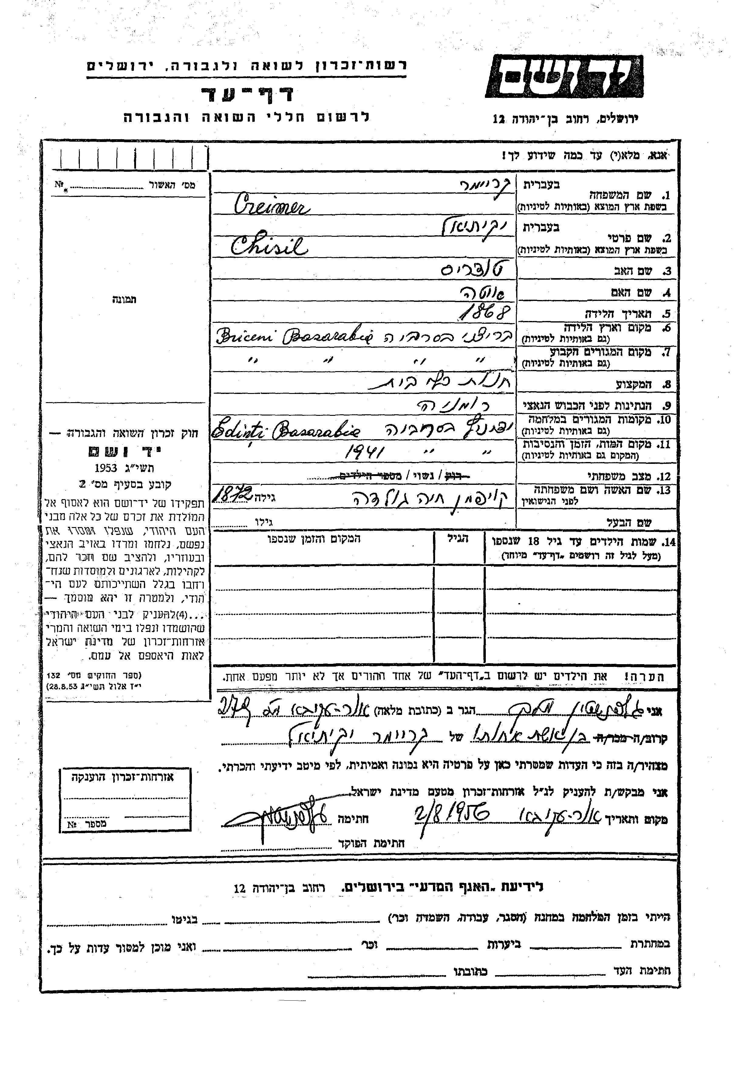 Chisil Creimer wurde im Jahr 1868 in Briceni, Rumänien geboren. Er war der Sohn von Todros und Ita. Er war Haushaltswarengeschäft und mit Khaia Golda, geb. Koifman Verheiratet. Vor dem Zweiten Weltkrieg lebte er in Briceni, Rumänien. Während des Krieges war er in Jedenice, Rumänien.