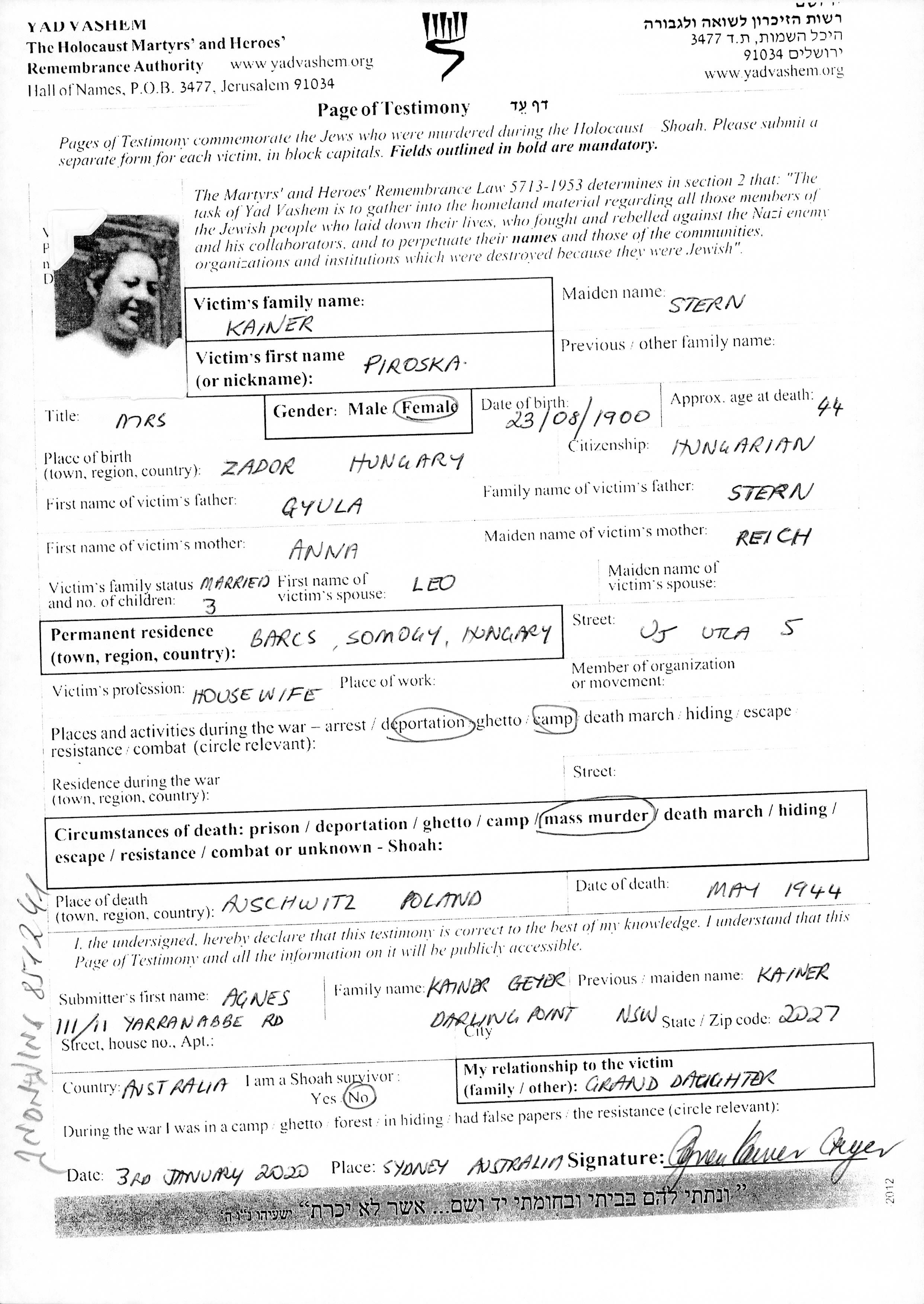 Piroska Kainer, geb. Stern wurde im Jahr 1900 in Zador geboren. Sie war die Tochter von Gyula und Anna, geb. Reich. Vor dem Zweiten Weltkrieg lebte sie in Barcs, Ungarn.