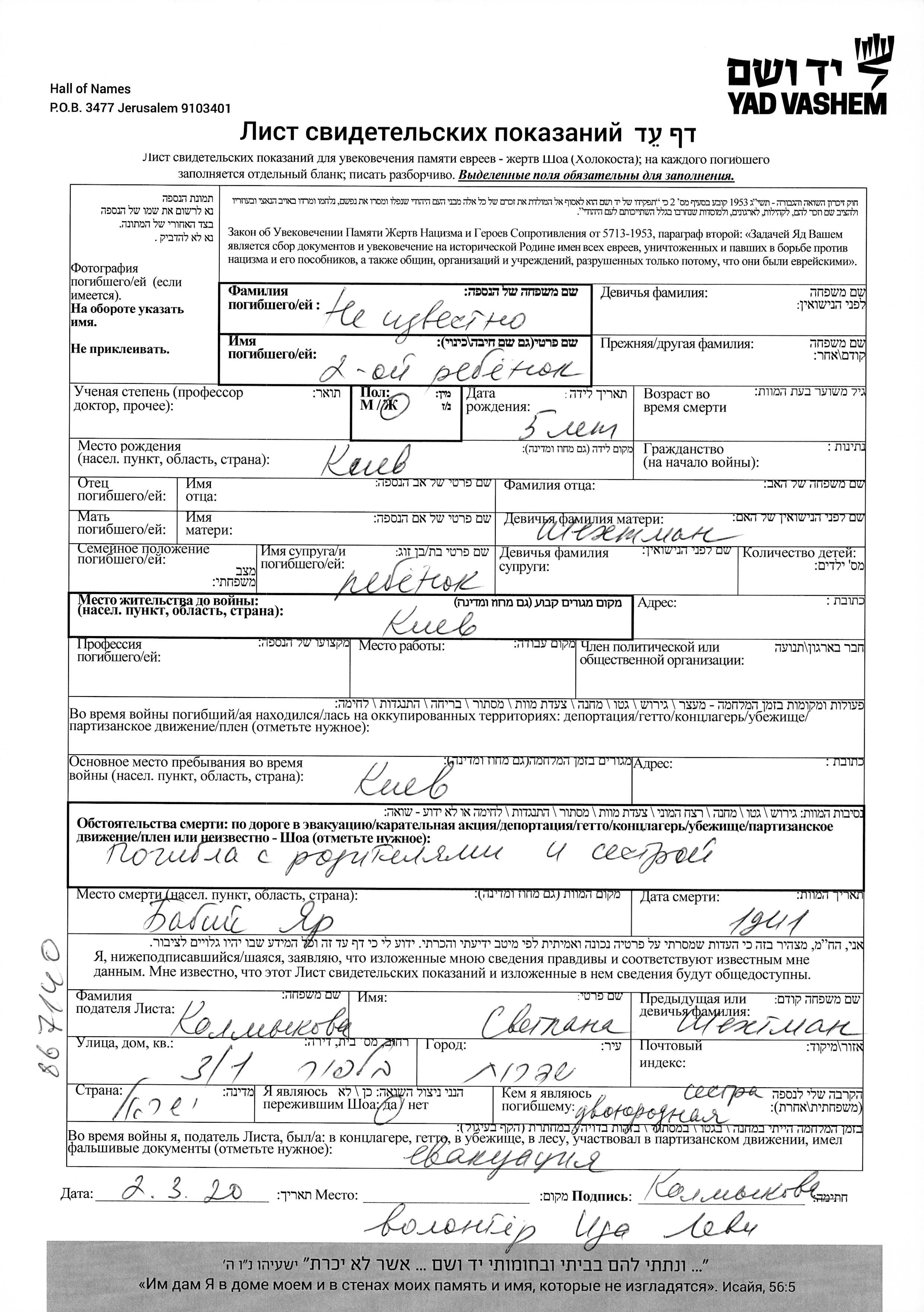 Name unbekannt Vorname unbekannt Kiev, Ukraine (UdSSR) Gedenkblatt