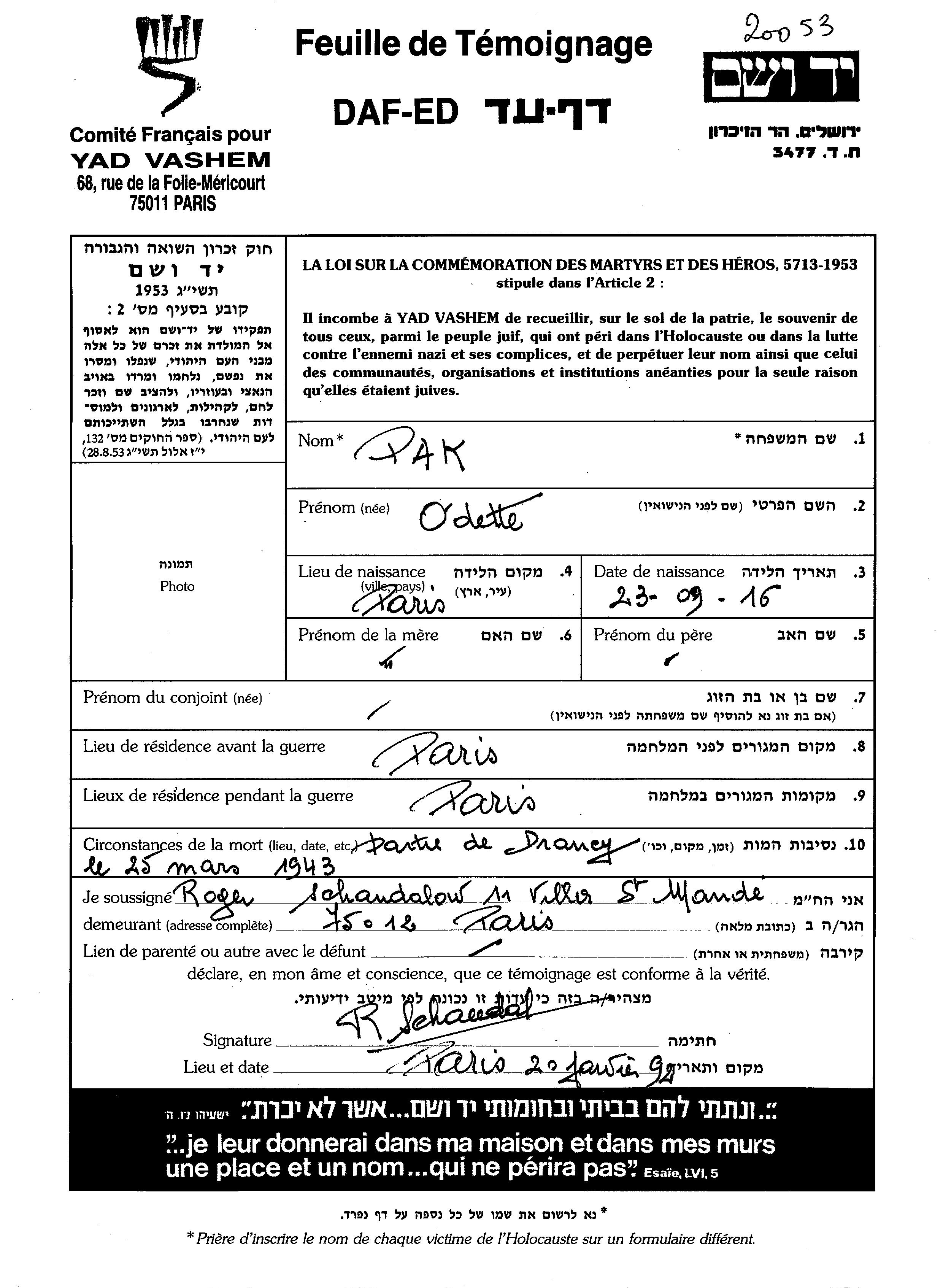 Odette wurde in der Schoah ermordet. Todesort: unbekannter Ort im Jahr 25/03/1943.