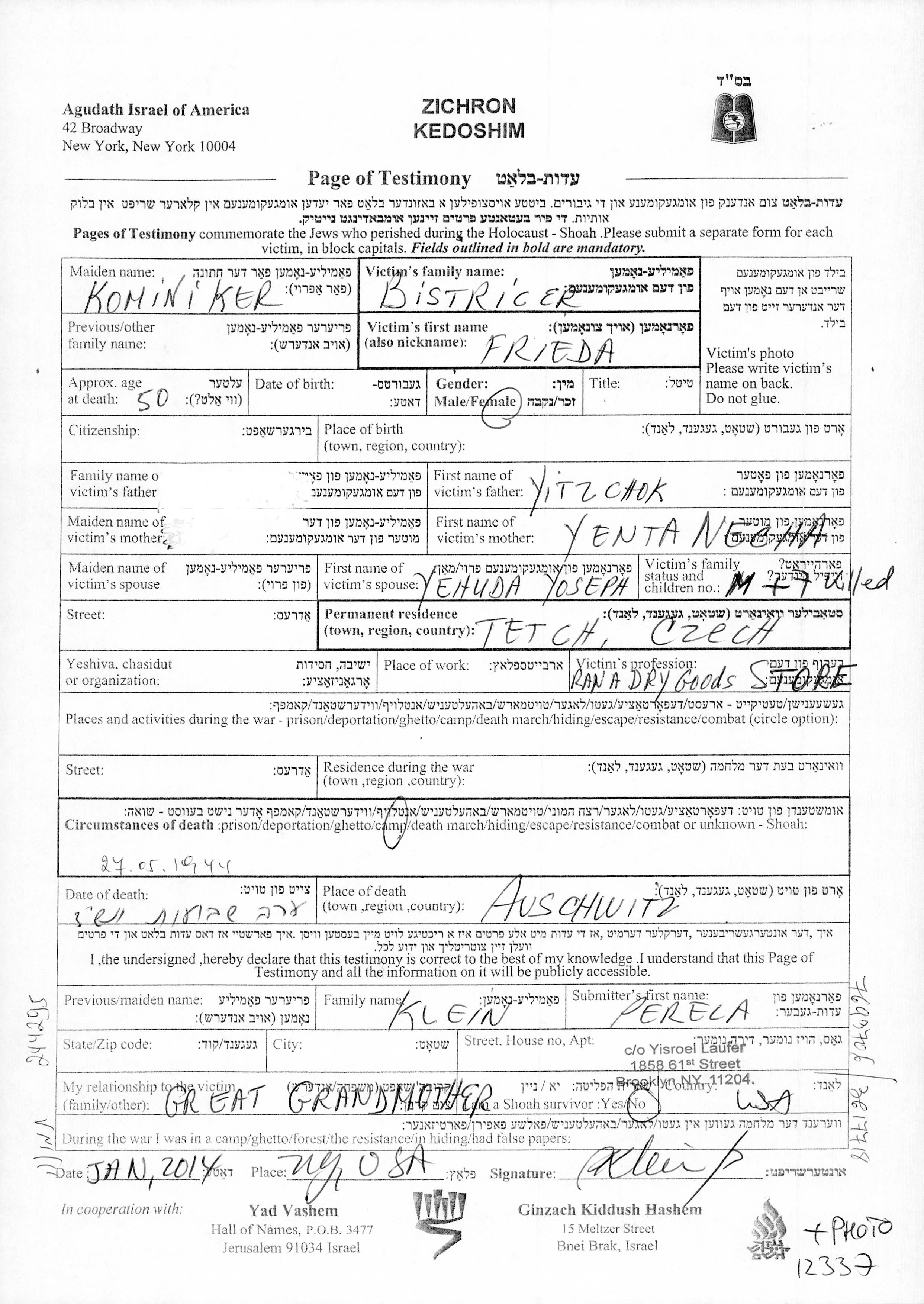 Frieda Bistricer, geb. Kominiker. Sie war Ladeninhaber. Vor dem Zweiten Weltkrieg lebte sie in Tech, Tschechoslowakei.