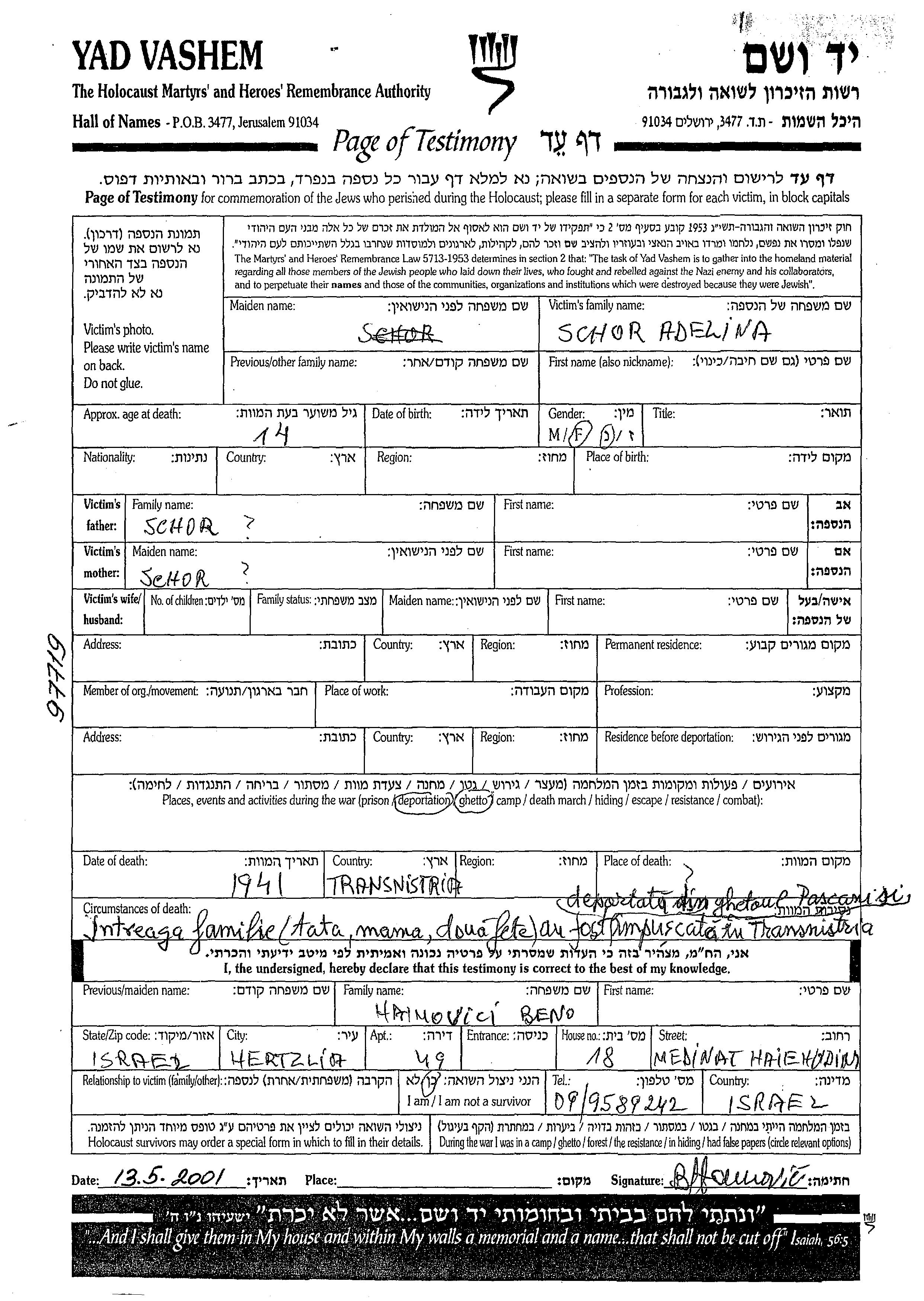 Adelina Schor wurde im Jahr 1930 in Rumänien geboren. Vor dem Zweiten Weltkrieg lebte sie in Pascani, Rumänien.