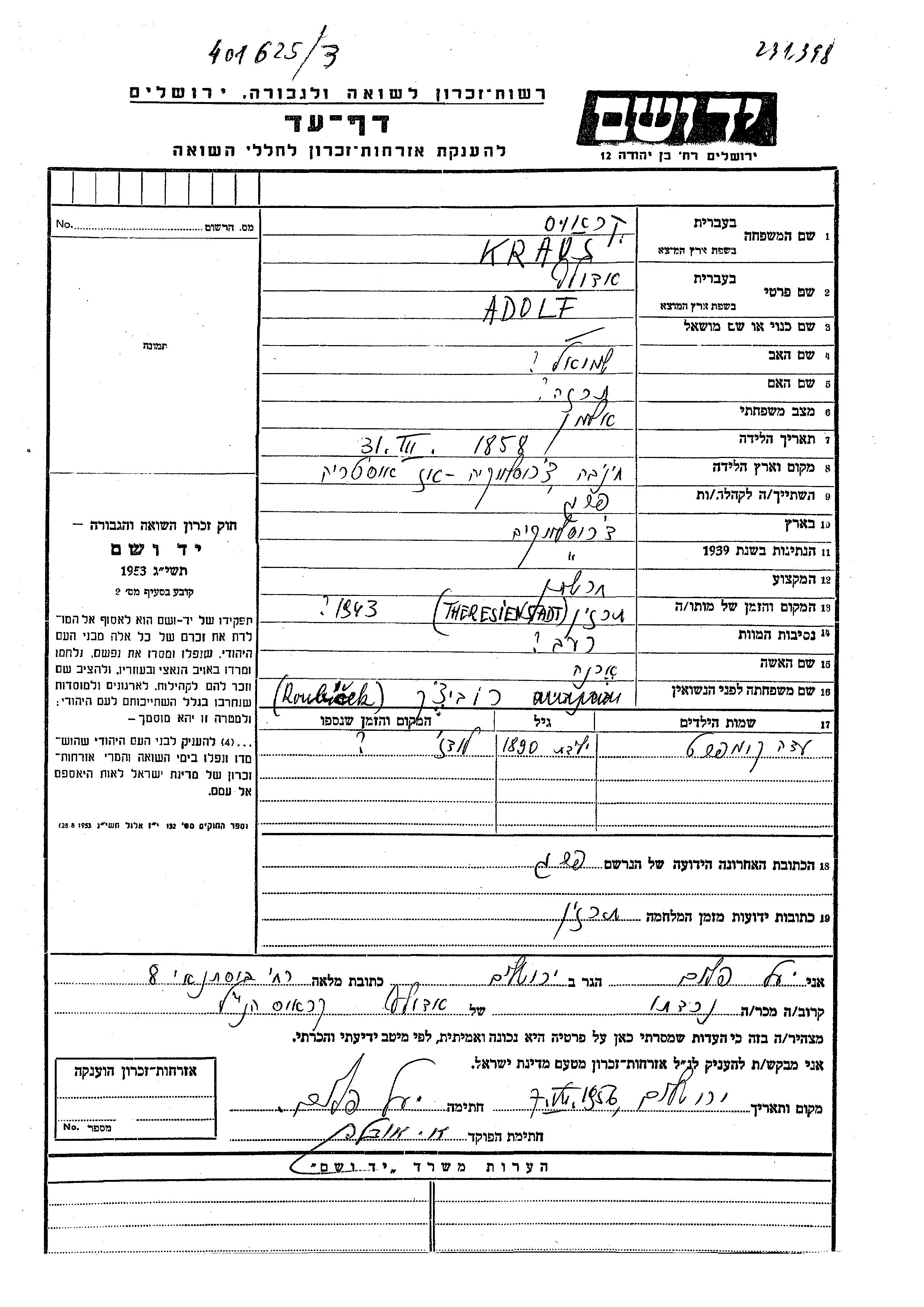 Adolf Kraus wurde im Jahr 1858 in Hanva, Tschechoslowakei geboren. Er war der Sohn von Shmuel und Tereza. Er war Fabrikant/-in und mit Erna, geb. Rubichek Witwer. Vor dem Zweiten Weltkrieg lebte er in Prague, Tschechoslowakei. Während des Krieges war er in Terezin, Tschechoslowakei.