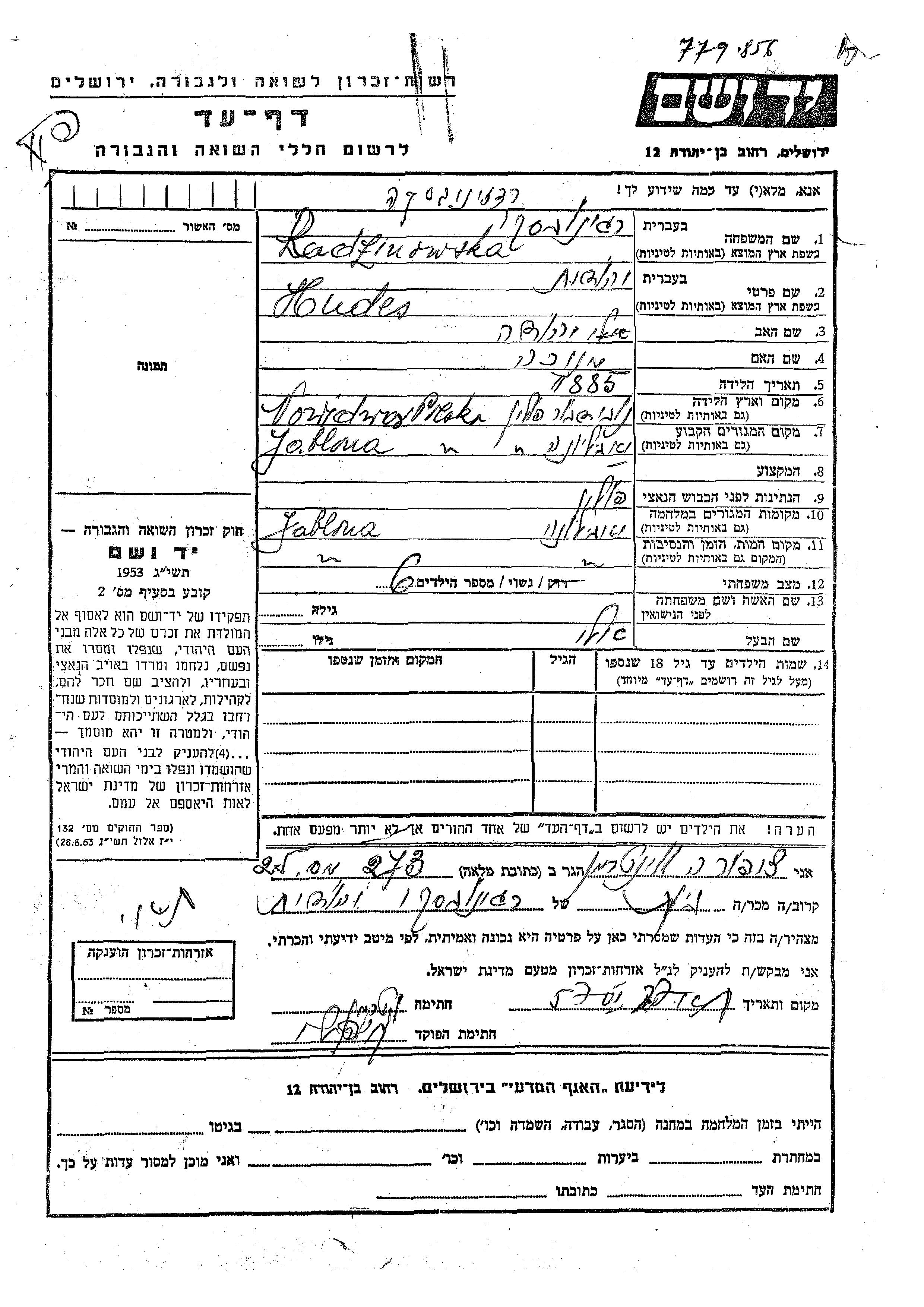 Yehudit Radzinowska wurde im Jahr 1885 in Nowy Dwor, Polen geboren. Sie war die Tochter von Yehuda und Menukha. Sie war mit Eli Verheiratet. Vor dem Zweiten Weltkrieg lebte sie in Jablonna, Polen. Während des Krieges war sie in Jablonna, Polen.