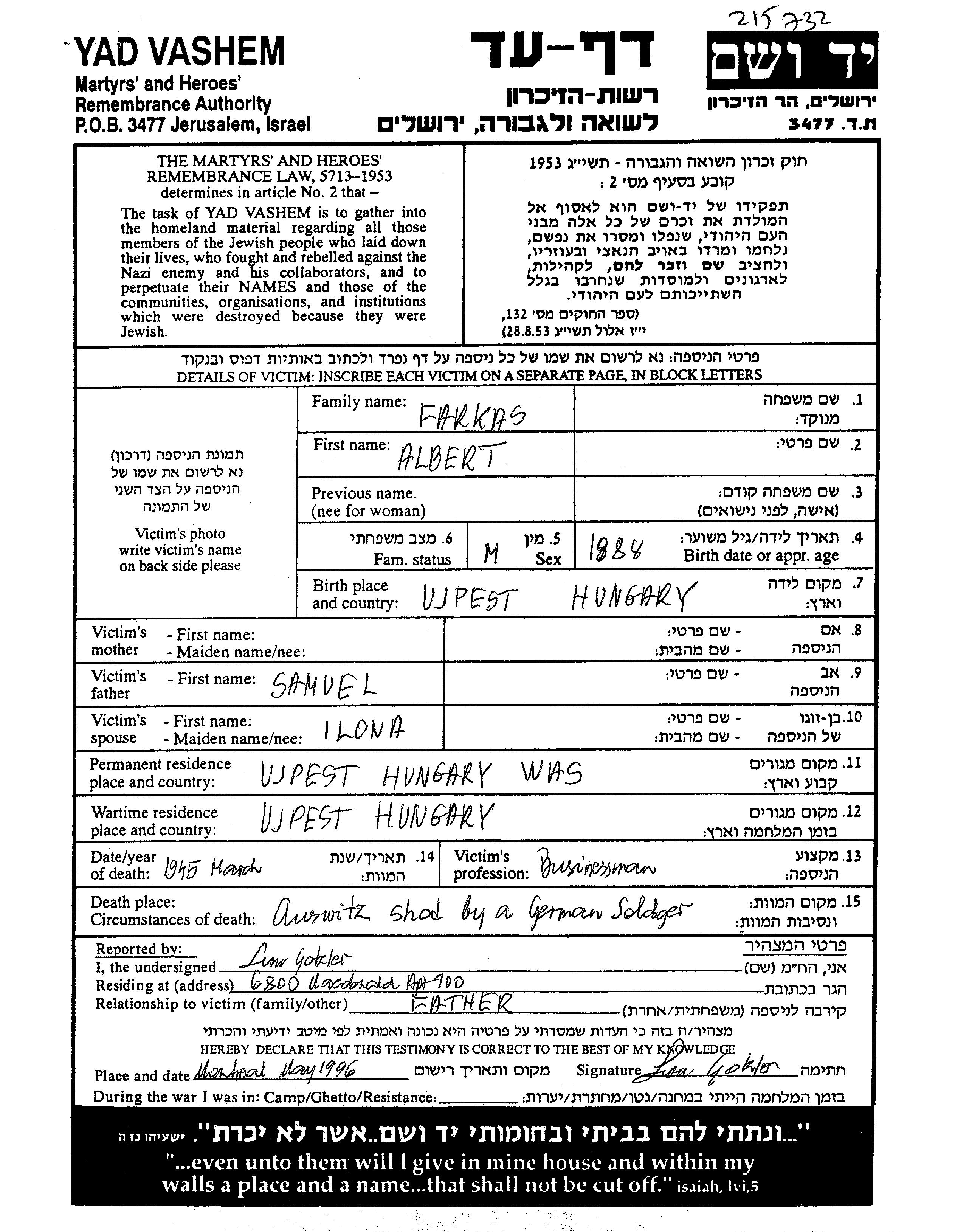| Farkas | Albert | 1888 | Ujpest, Ungarn | Liste ermordeter Juden aus Gedenkbuechern (Yizkor Books) |