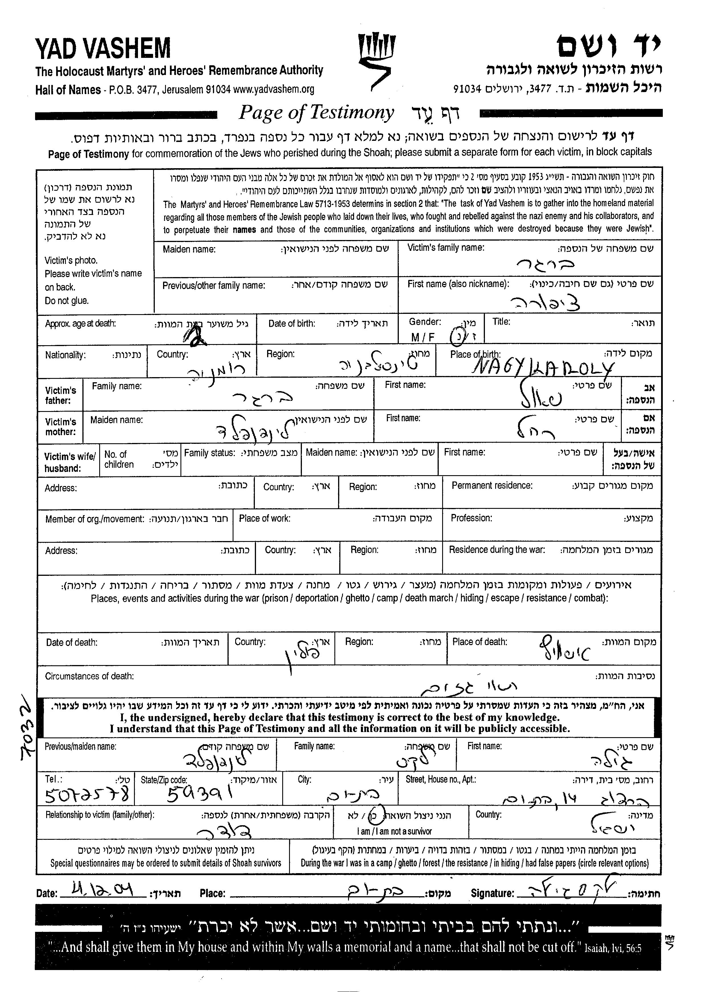 Stadt/Ortschaft oder Lager/Ghetto oder Bezirk/Region oder Land