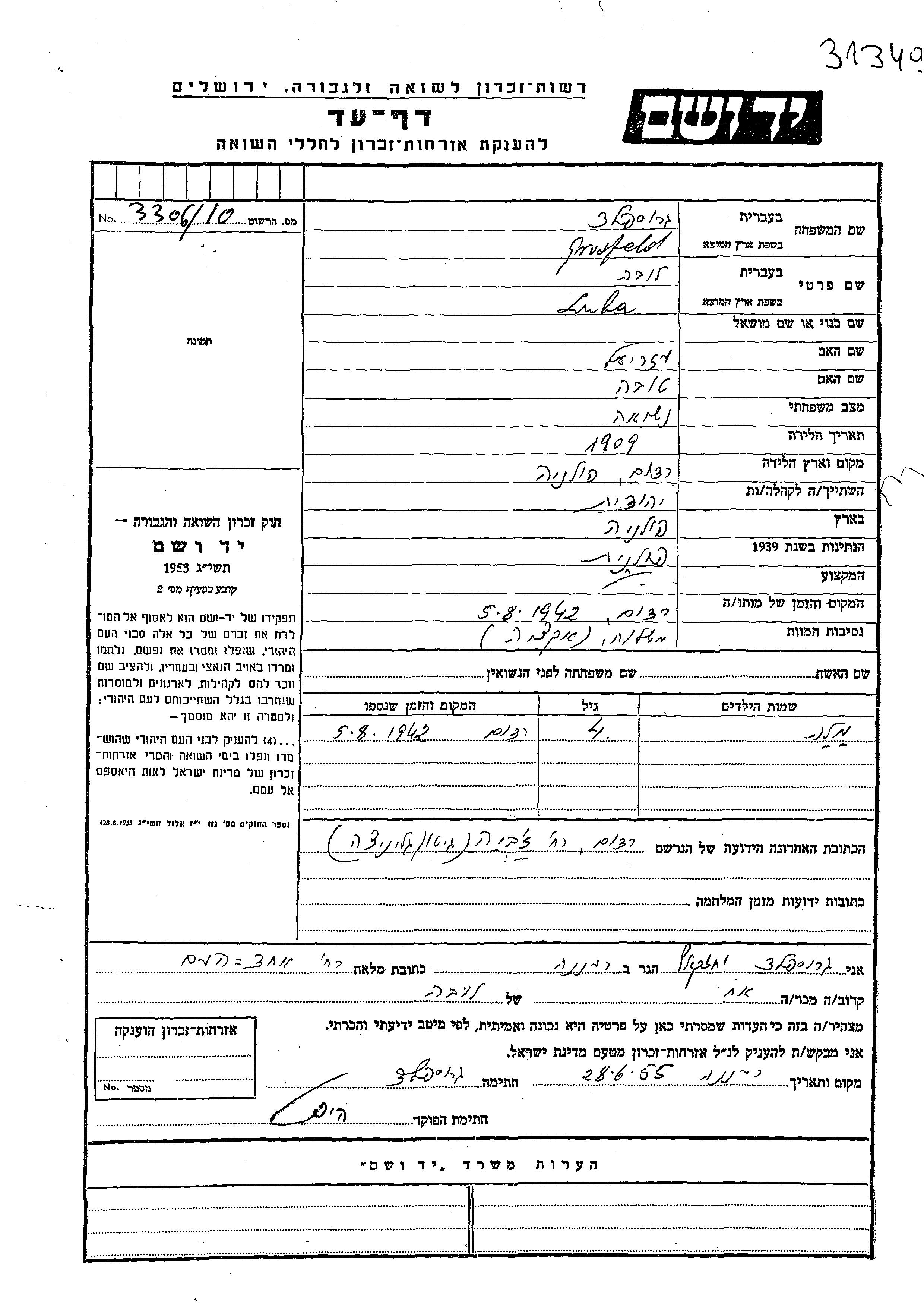 Luba wurde in der Schoah ermordet. Todesort: Radom, Polen im Jahr 05/08/1942.