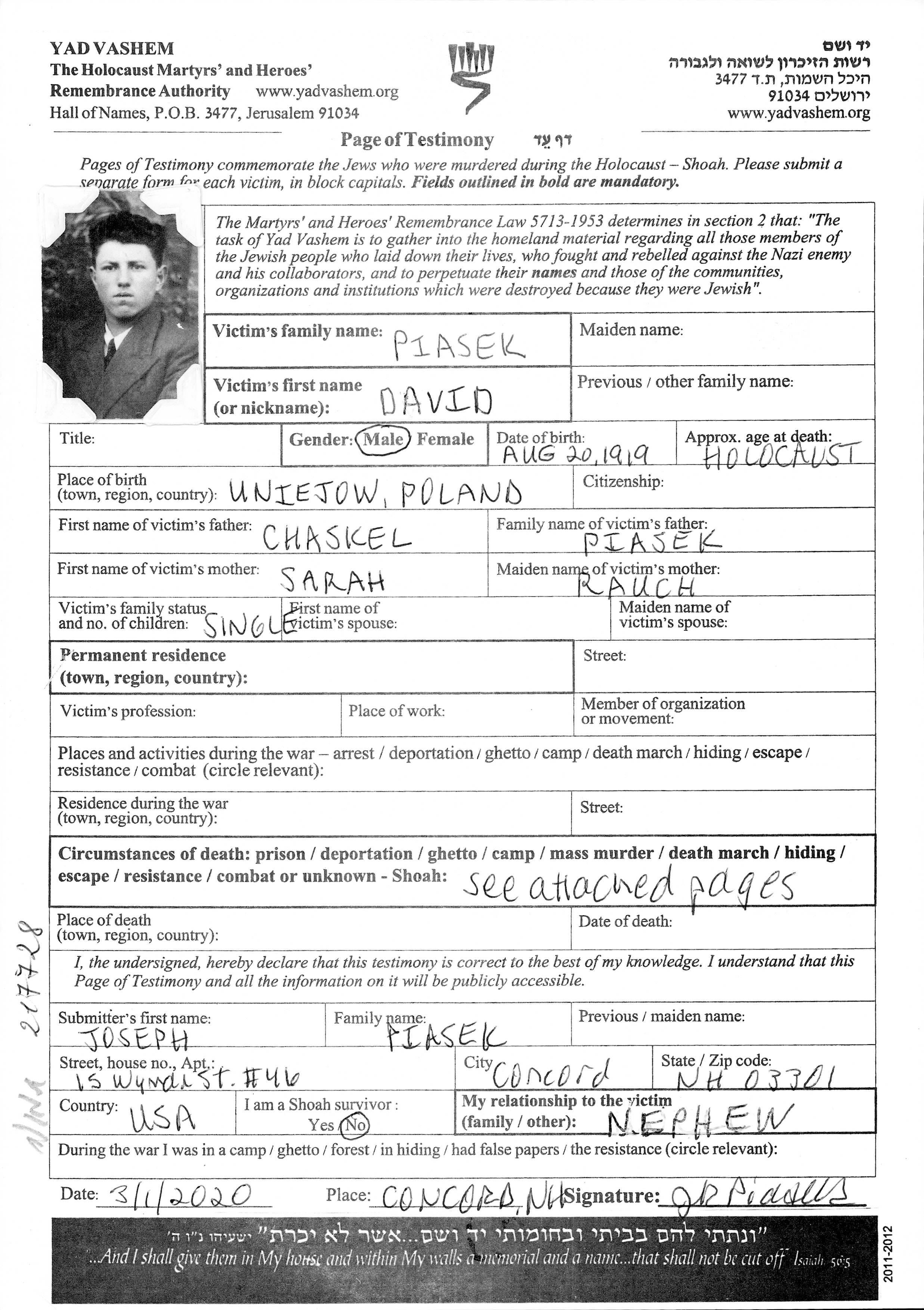 Piasek David 1919 unbekannter Ort, Gedenkblatt