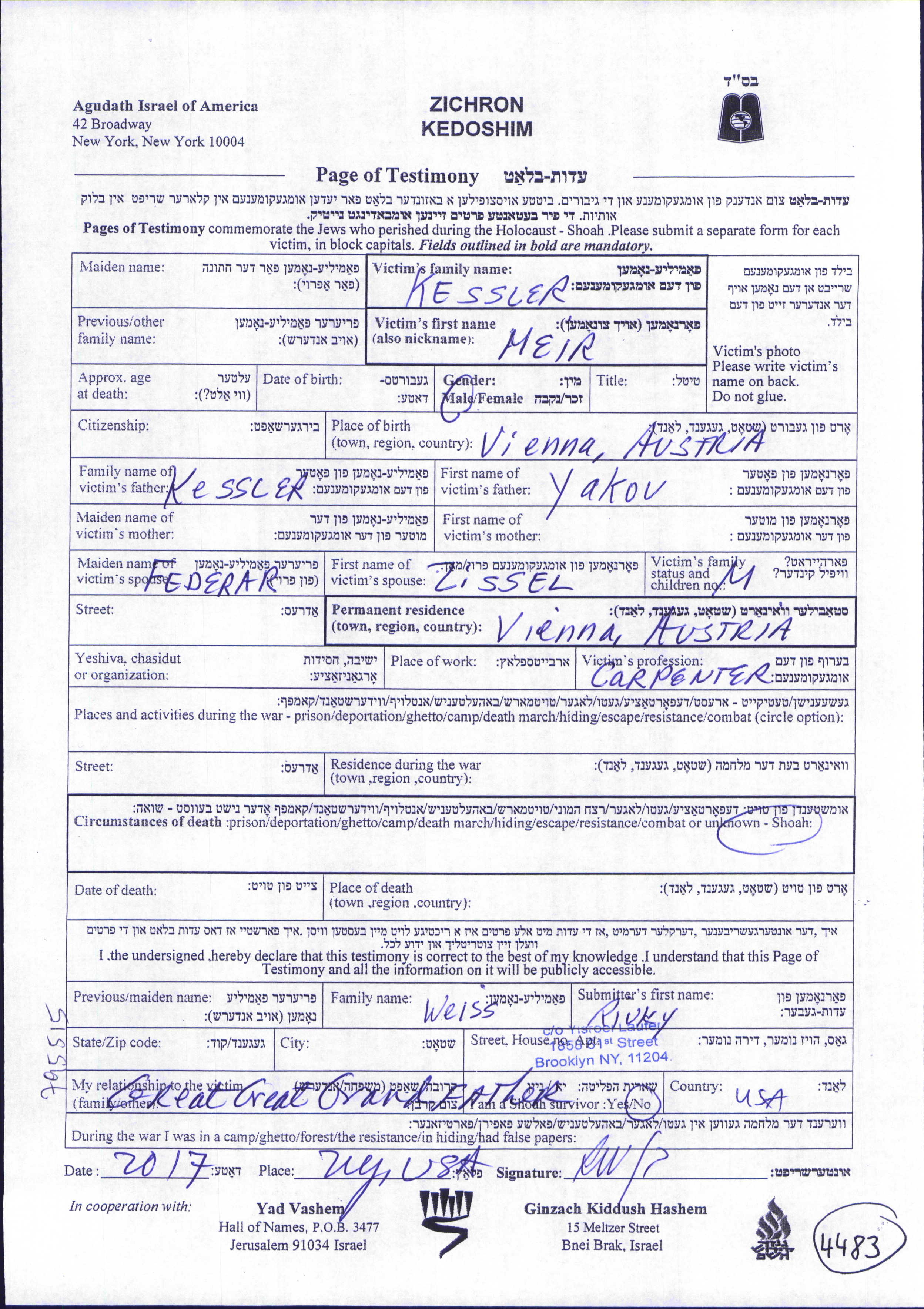 Meir Kessler wurde im Jahr 1873 in unbekannter Ort geboren. Vor dem Zweiten Weltkrieg lebte er in Wien, Österreich.