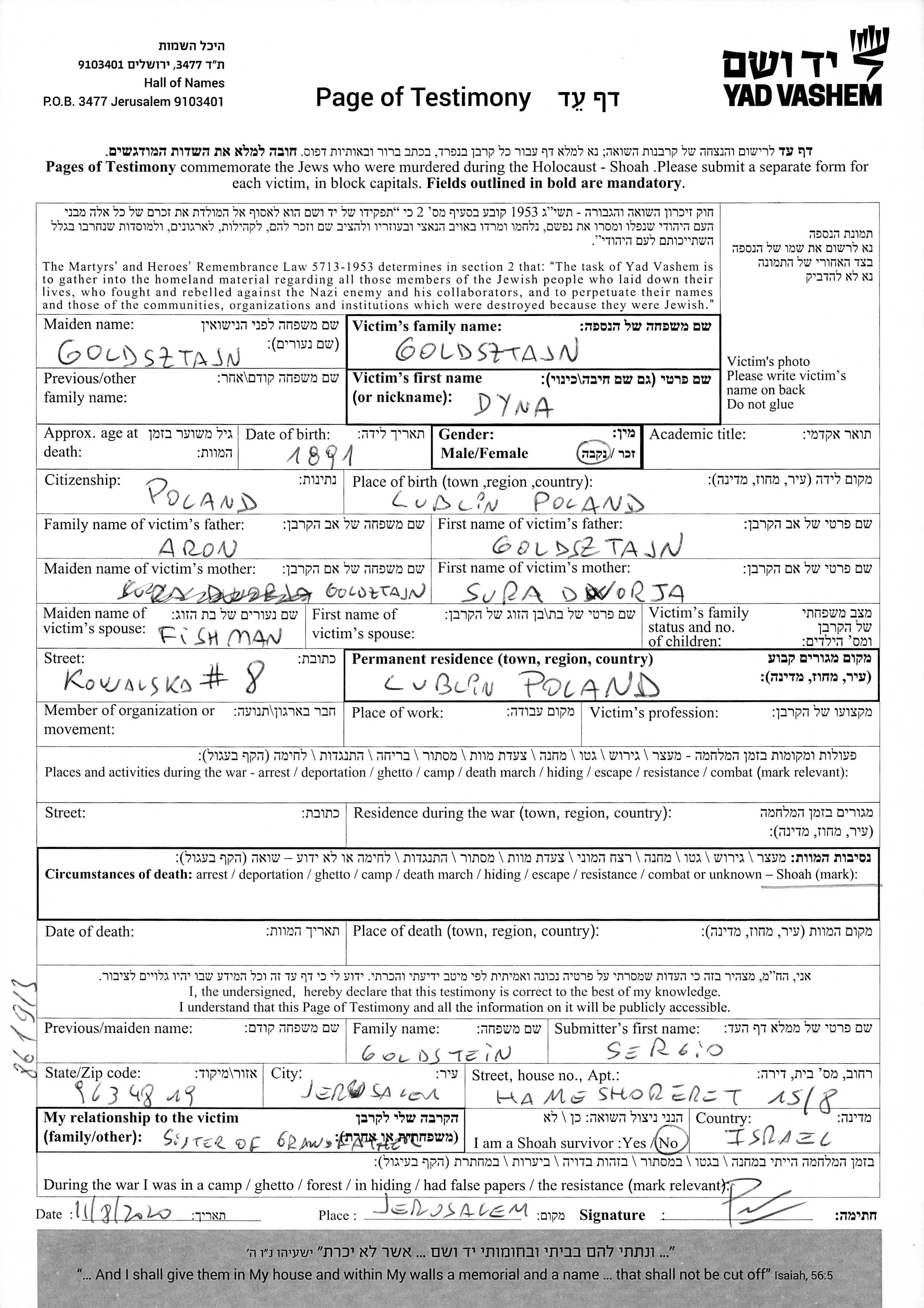 Dyna Fishman, geb. Goldsztajn wurde im Jahr 1891 in Lublin, Polen geboren. Sie war die Tochter von Aron und Sura Dworja. Vor dem Zweiten Weltkrieg lebte sie in Lublin, Polen.