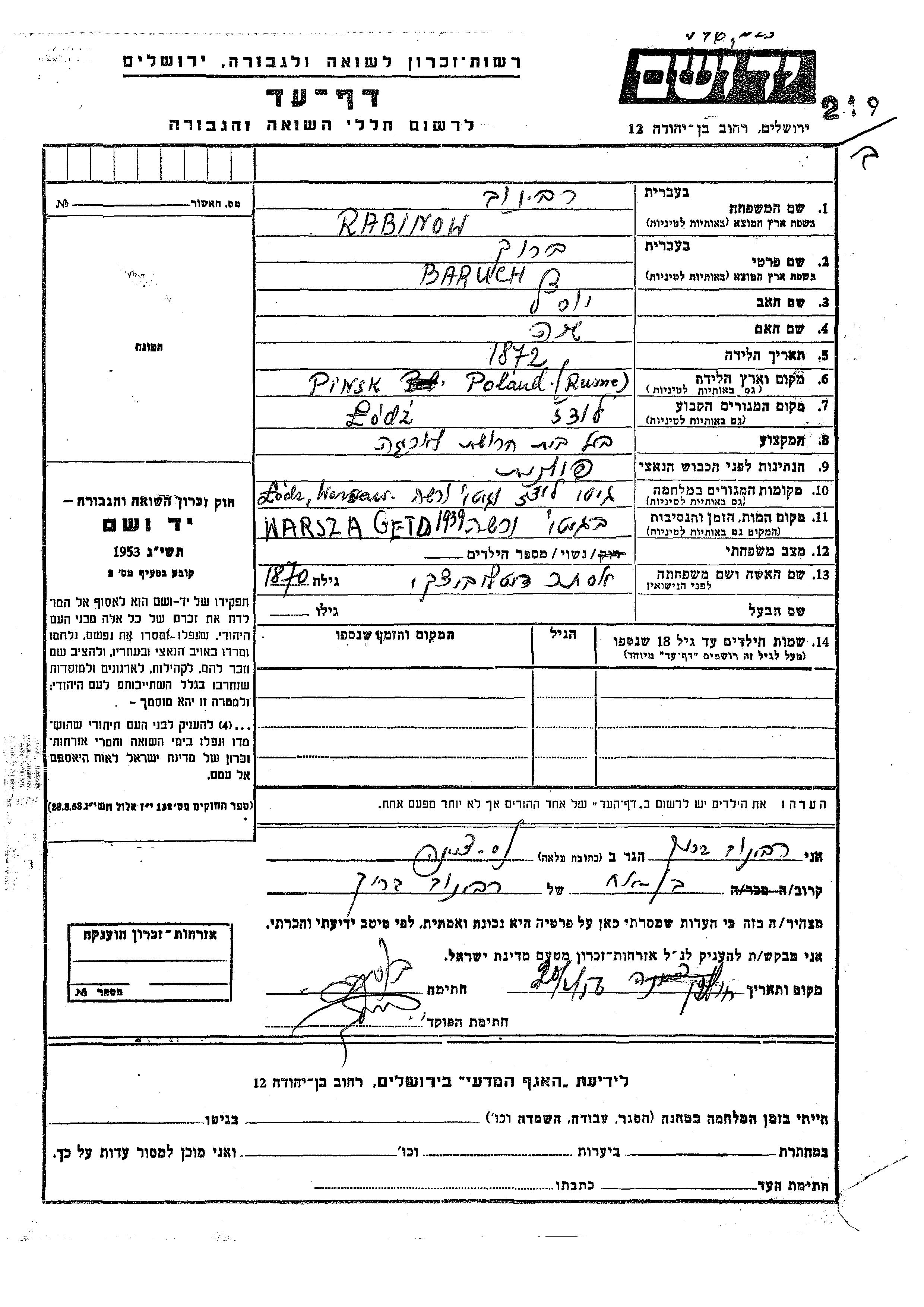 Baruch Rabinow wurde im Jahr 1872 in Pinsk, Polen geboren. Er war der Sohn von Yosef und Sara. Er war Besitzer einer webfabrik und mit Ester, geb. Diatlovitzki Verheiratet. Vor dem Zweiten Weltkrieg lebte er in Lodz, Polen. Während des Krieges war er in Warszawa, Polen.