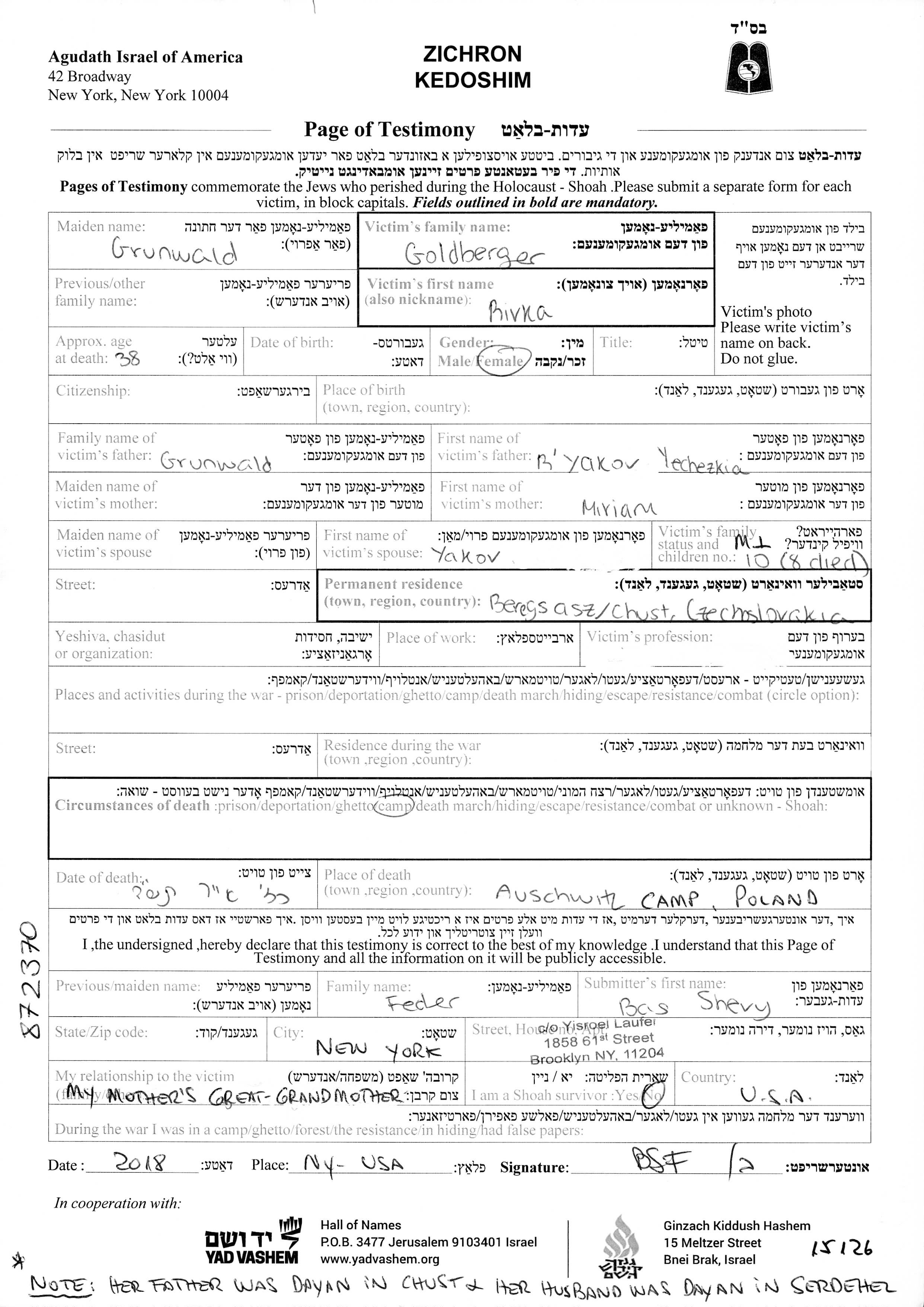 Rivka Goldberger, geb. Grunwald wurde Sie war die Tochter von Yakov Yechezkia und Miriam. Sie war mit Yakov Verheiratet. Vor dem Zweiten Weltkrieg lebte sie in Beregszasz, Tschechoslowakei. Während des Krieges war sie in Auschwitz, Polen.