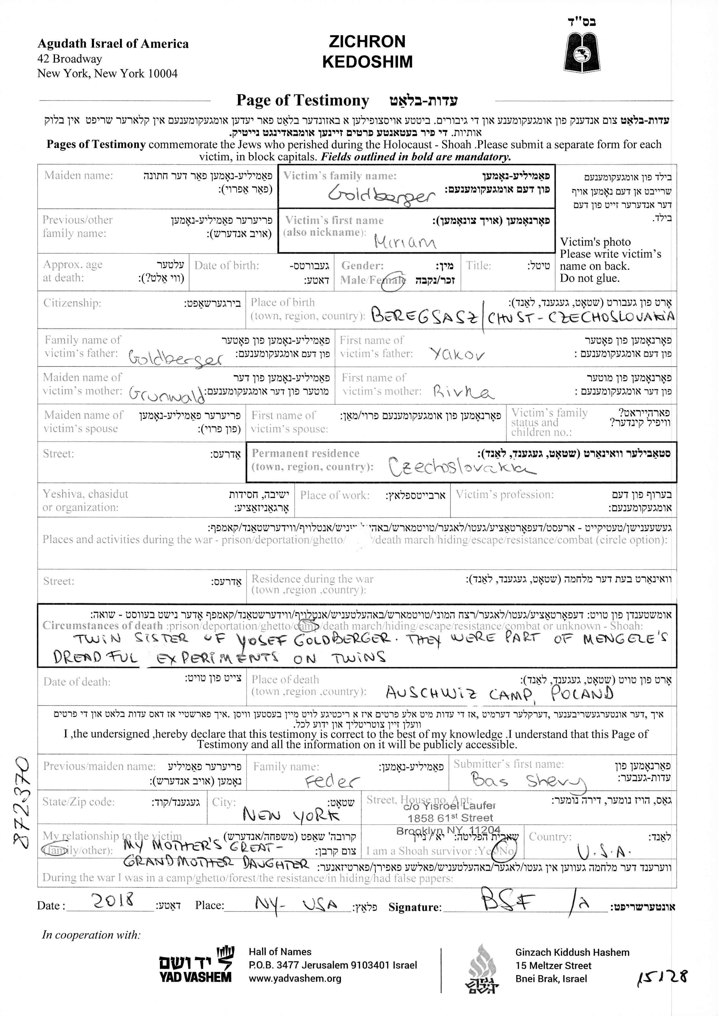 Twin sister to Joseph Goldberger who were part of Mengele's experiments