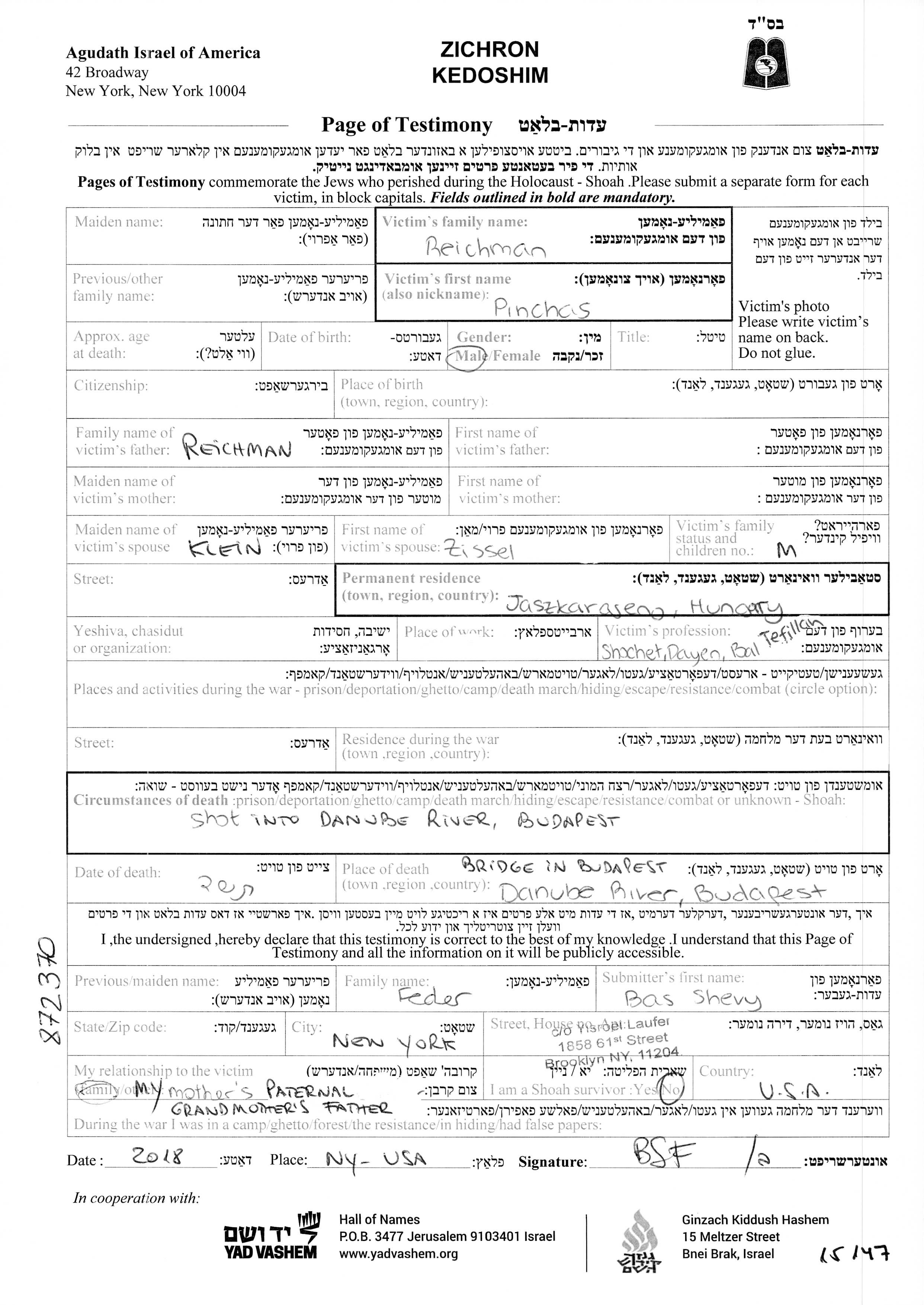Pinchas Reichman. Er war Schächter und mit Zissel, geb. Klein Verheiratet. Vor dem Zweiten Weltkrieg lebte er in Jaszkarajeno, Ungarn. Während des Krieges war er in Budapest, Ungarn.