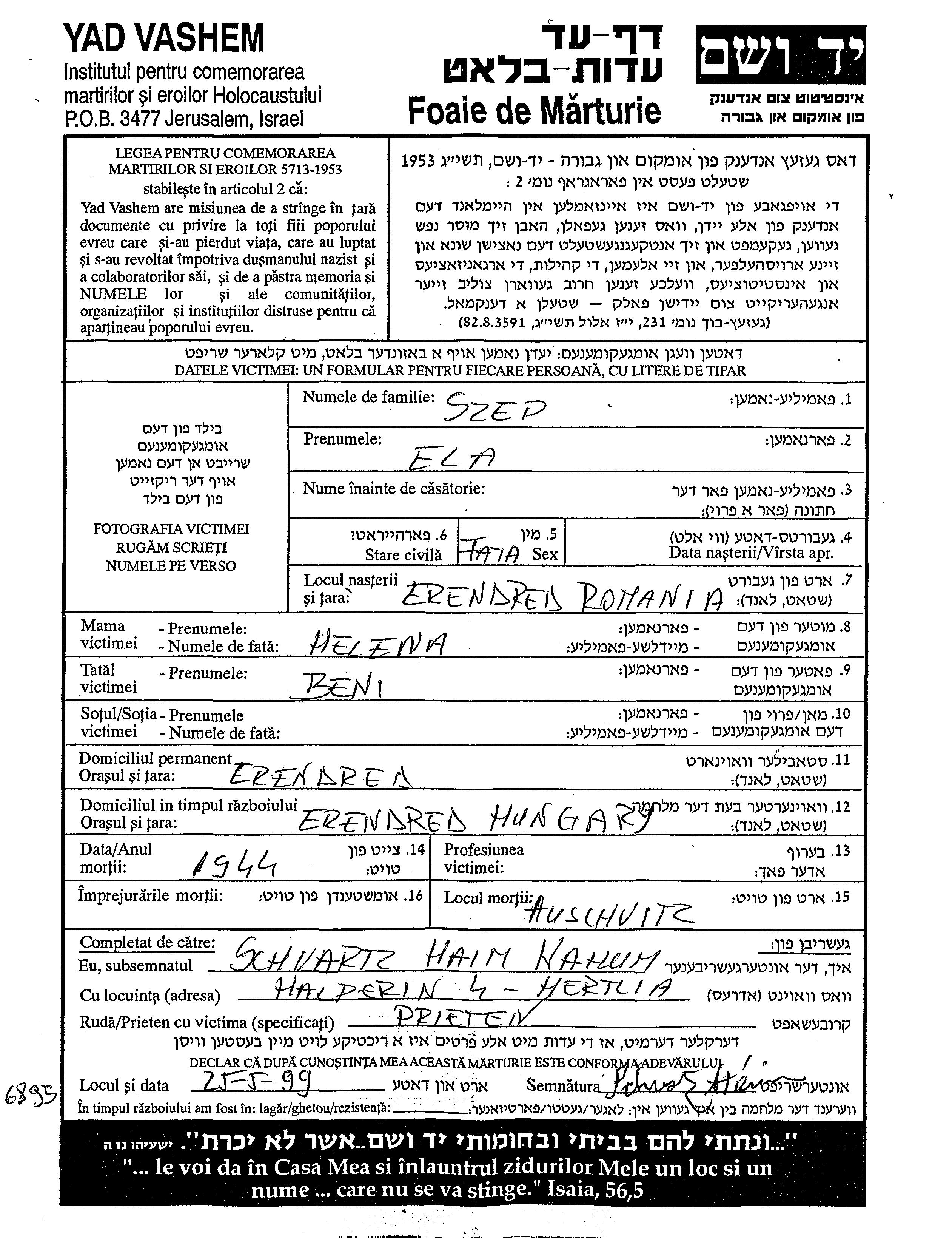 Ela Szep wurde in Erendred, Rumänien geboren. Vor dem Zweiten Weltkrieg lebte sie in Erendred, Rumänien.