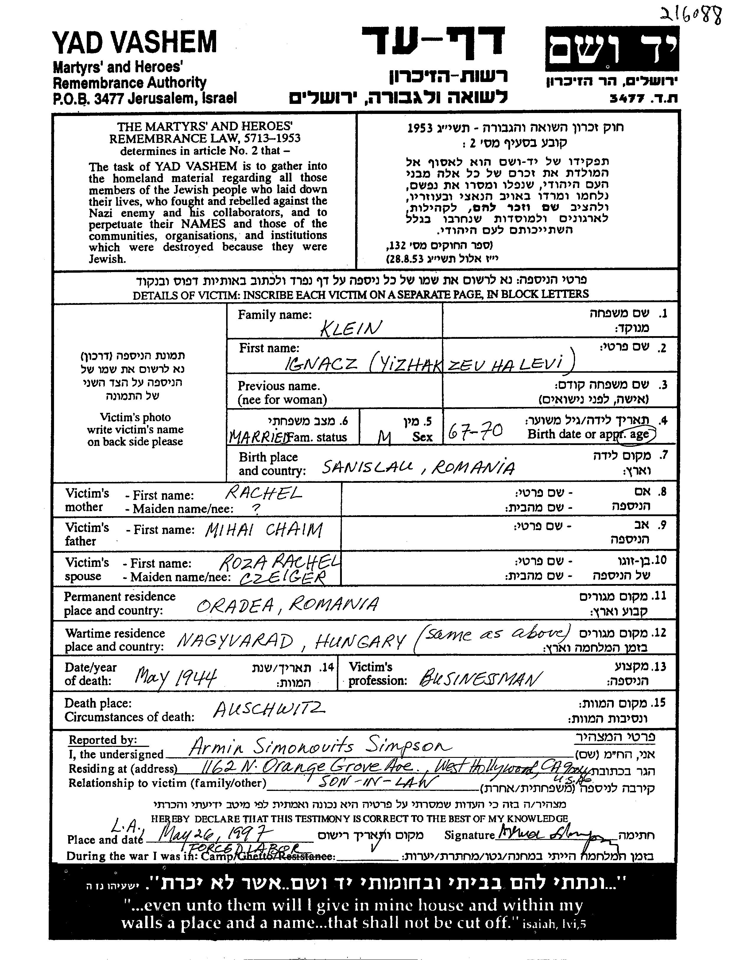 Yitzkhak Zeev Ignatz wurde in der Schoah ermordet. Todesort: Auschwitz, Polen im Jahr 1944.