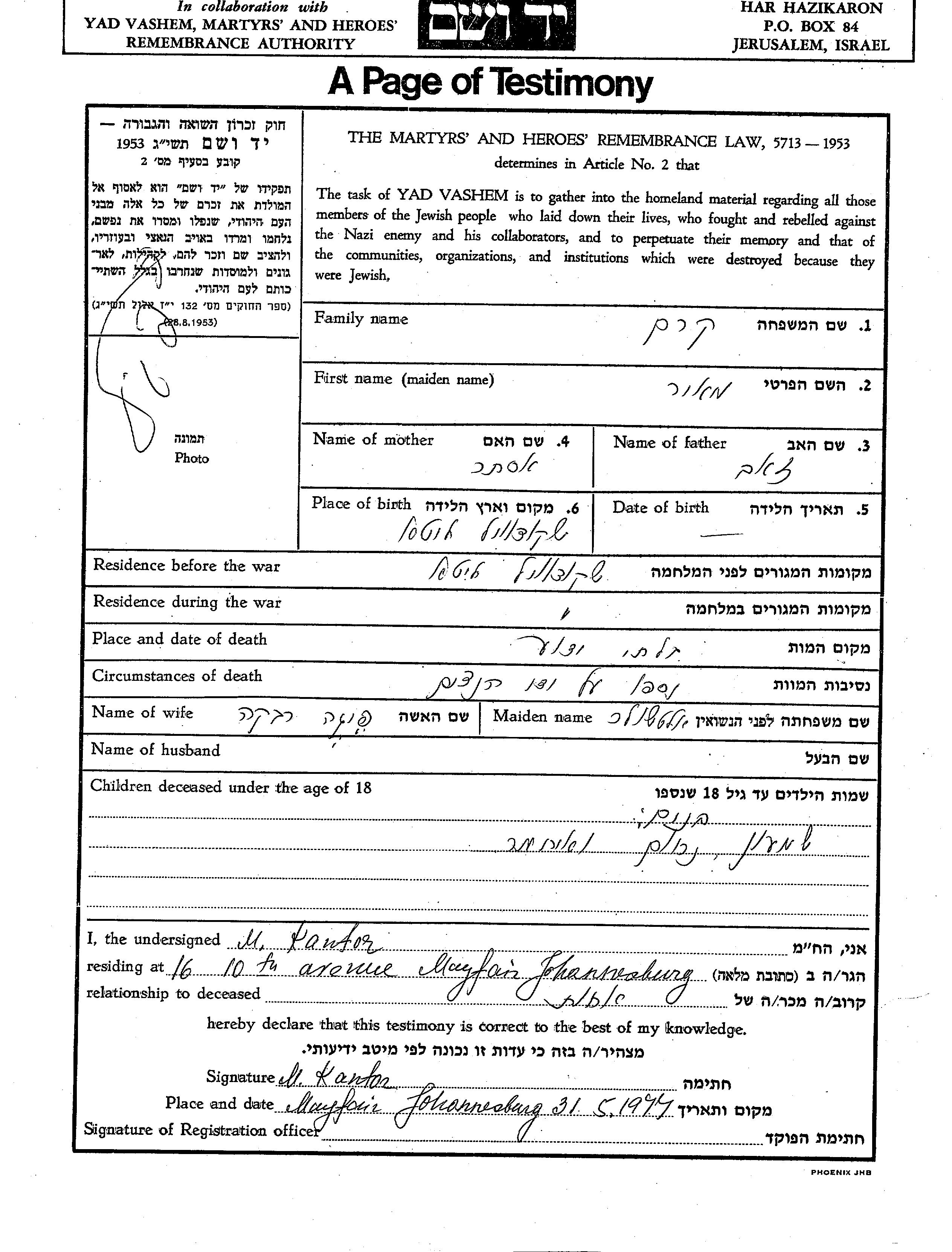 Shimon wurde in der Schoah ermordet. Todesort: Skaudvile, Litauen.