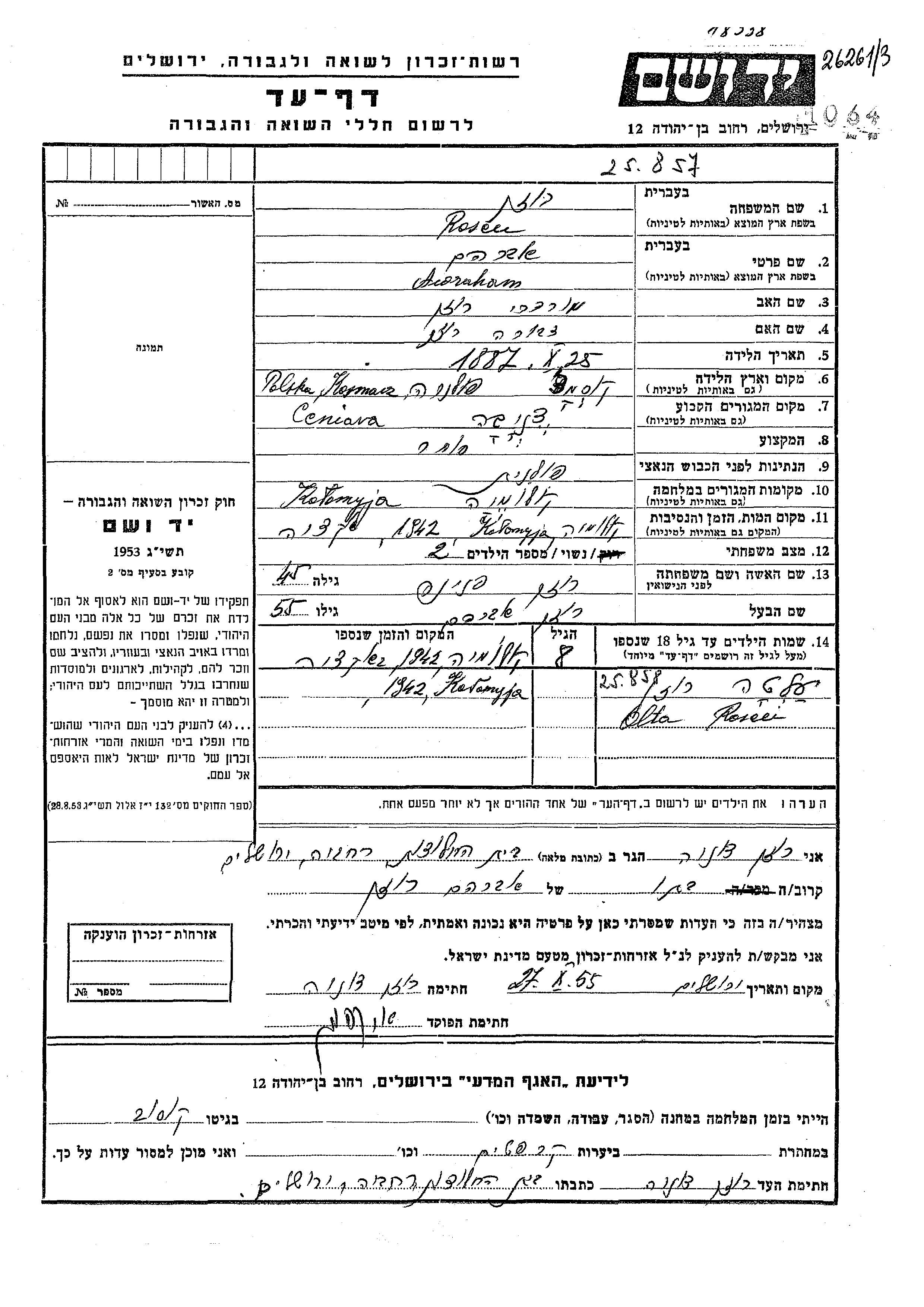 Awraham Rosen wurde im Jahr 1887 in Kosmach, Polen geboren. Er war der Sohn von Mordechai und Dvora. Er war Kaufmann/-frau. Vor dem Zweiten Weltkrieg lebte er in Ceniawa, Polen. Während des Krieges war er in Kolomyja, Polen.