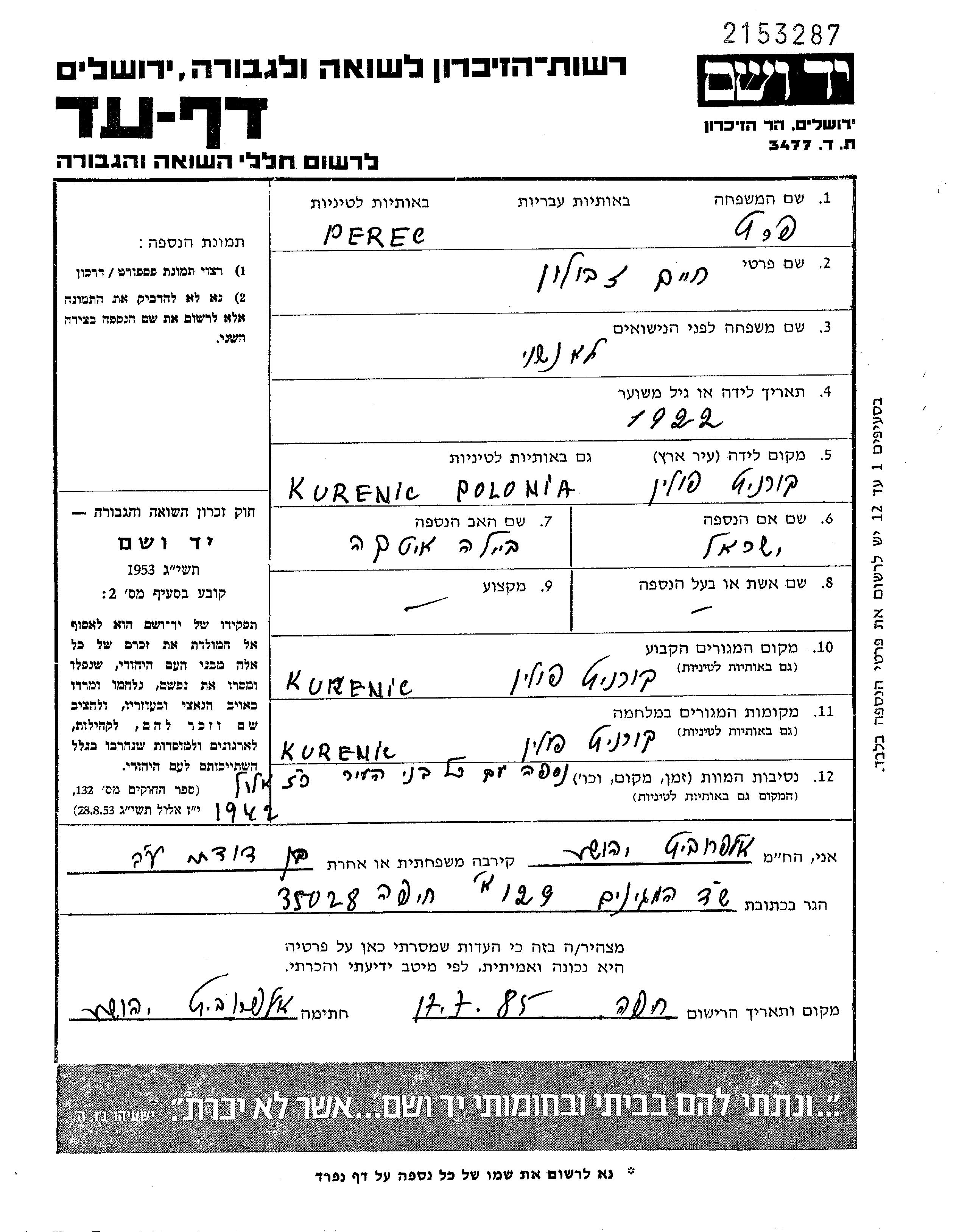 Zevulun Chaim Peretz wurde im Jahr 1922 in Kurenets, Polen geboren. Vor dem Zweiten Weltkrieg lebte er in Kurenets, Polen.