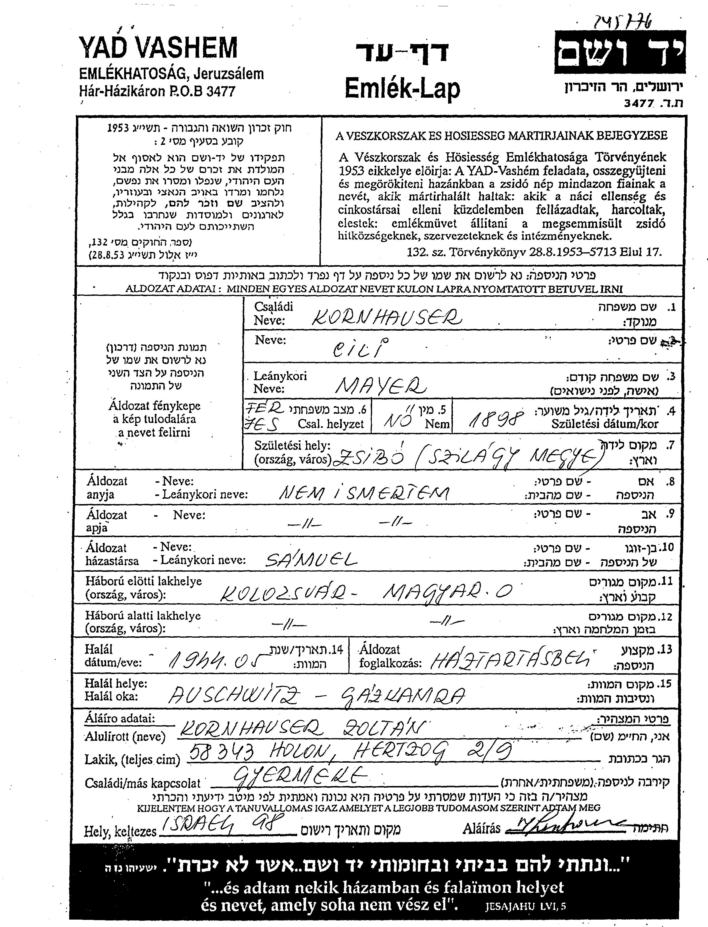 Cili Kornhauser, geb. Mayer wurde im Jahr 1898 in Zsibo, Rumänien geboren. Vor dem Zweiten Weltkrieg lebte sie in Kolozsvar, Rumänien.