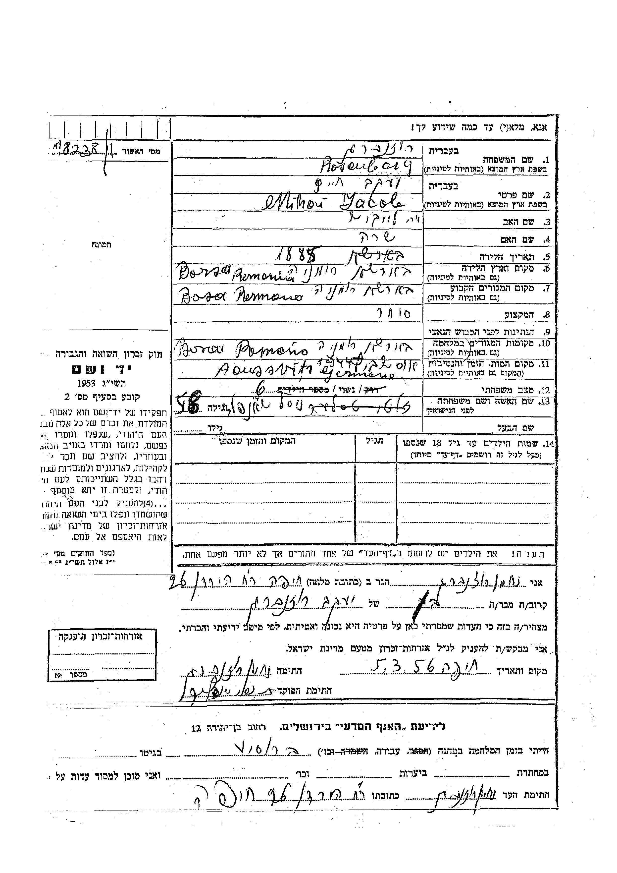 Yacob Mihai Khaim Rosenberg wurde im Jahr 1885 in Brasov, Rumänien geboren. Er war der Sohn von Leibish und Sara. Er war Kaufmann/-frau und mit Zysl, geb. Sheinfeld Verheiratet. Vor dem Zweiten Weltkrieg lebte er in Barsa, Rumänien. Während des Krieges war er in Barsa, Rumänien.
