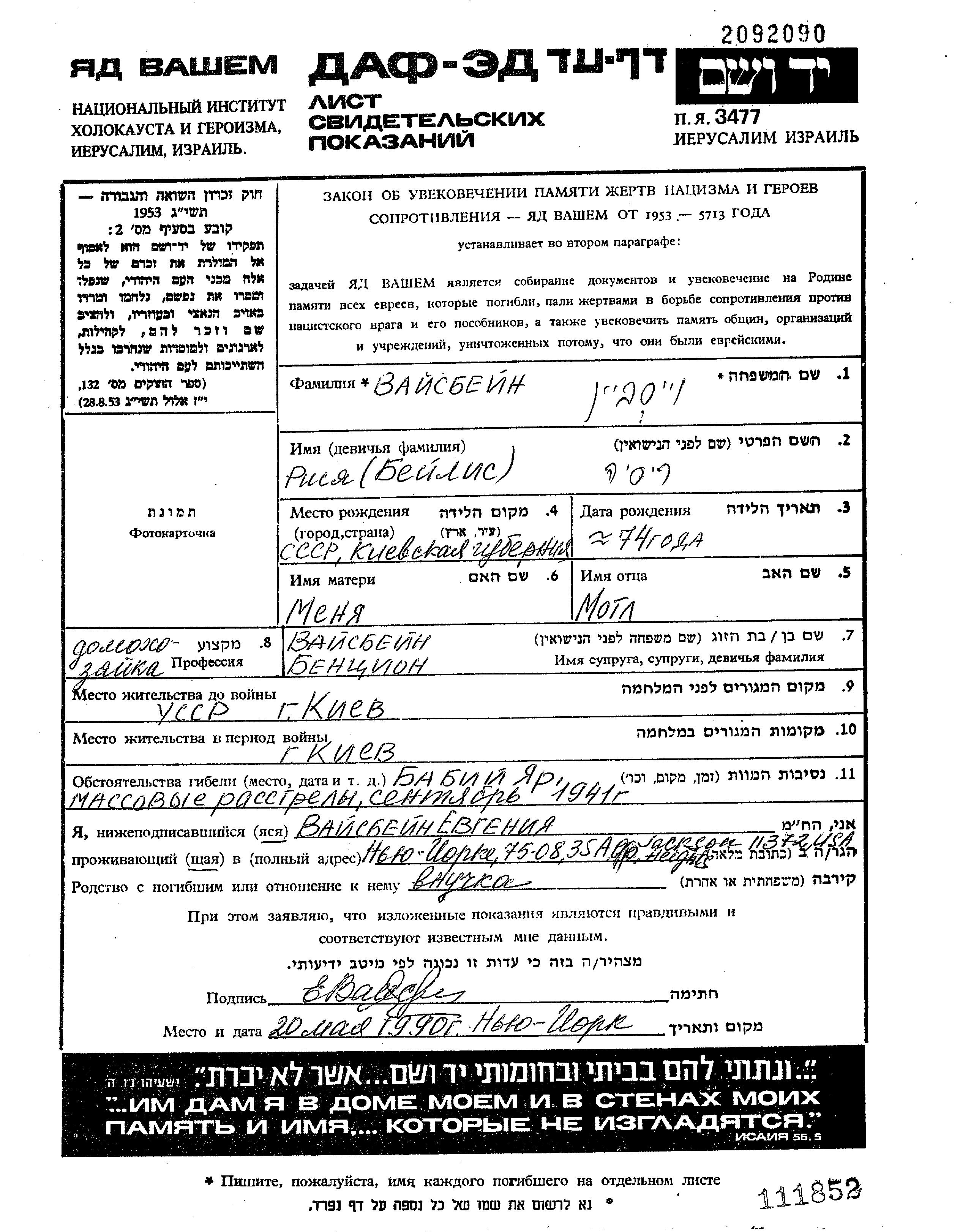 Rysya Risya Vaisbein, geb. Beilis wurde in Kiev, Ukraine (UdSSR) geboren. Sie war Hausfrau. Vor dem Zweiten Weltkrieg lebte sie in Kiev, Ukraine (UdSSR).
