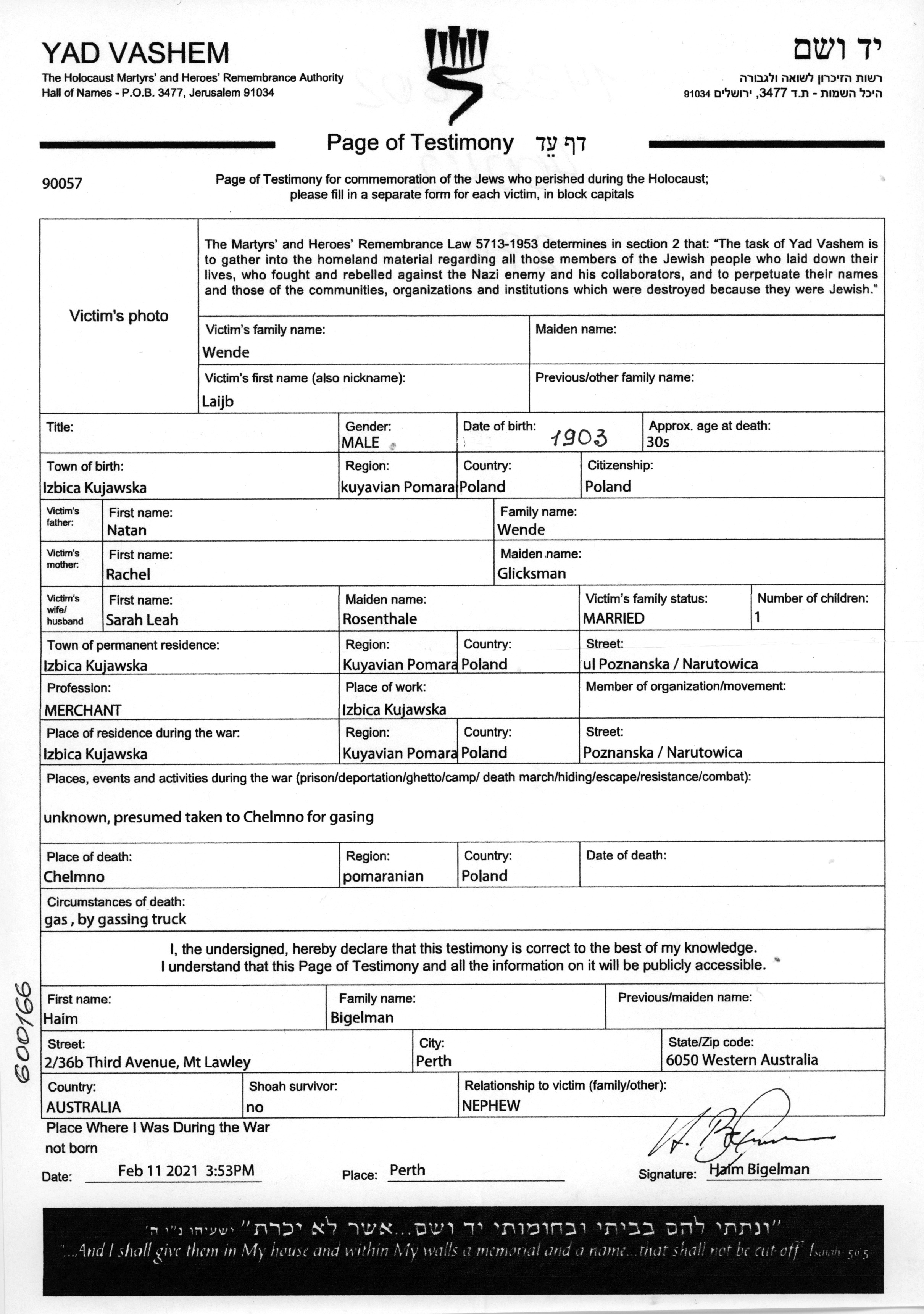 Laijb Wende wurde in Izbica Kujawska, Polen geboren. Er war der Sohn von Natan und Rachel, geb. Glicksman. Er war Kaufmann/-frau und mit Sarah Leah, geb. Rosenthale Verheiratet. Vor dem Zweiten Weltkrieg lebte er in Izbica Kujawska, Polen. Während des Krieges war er in Chelmno, Polen.