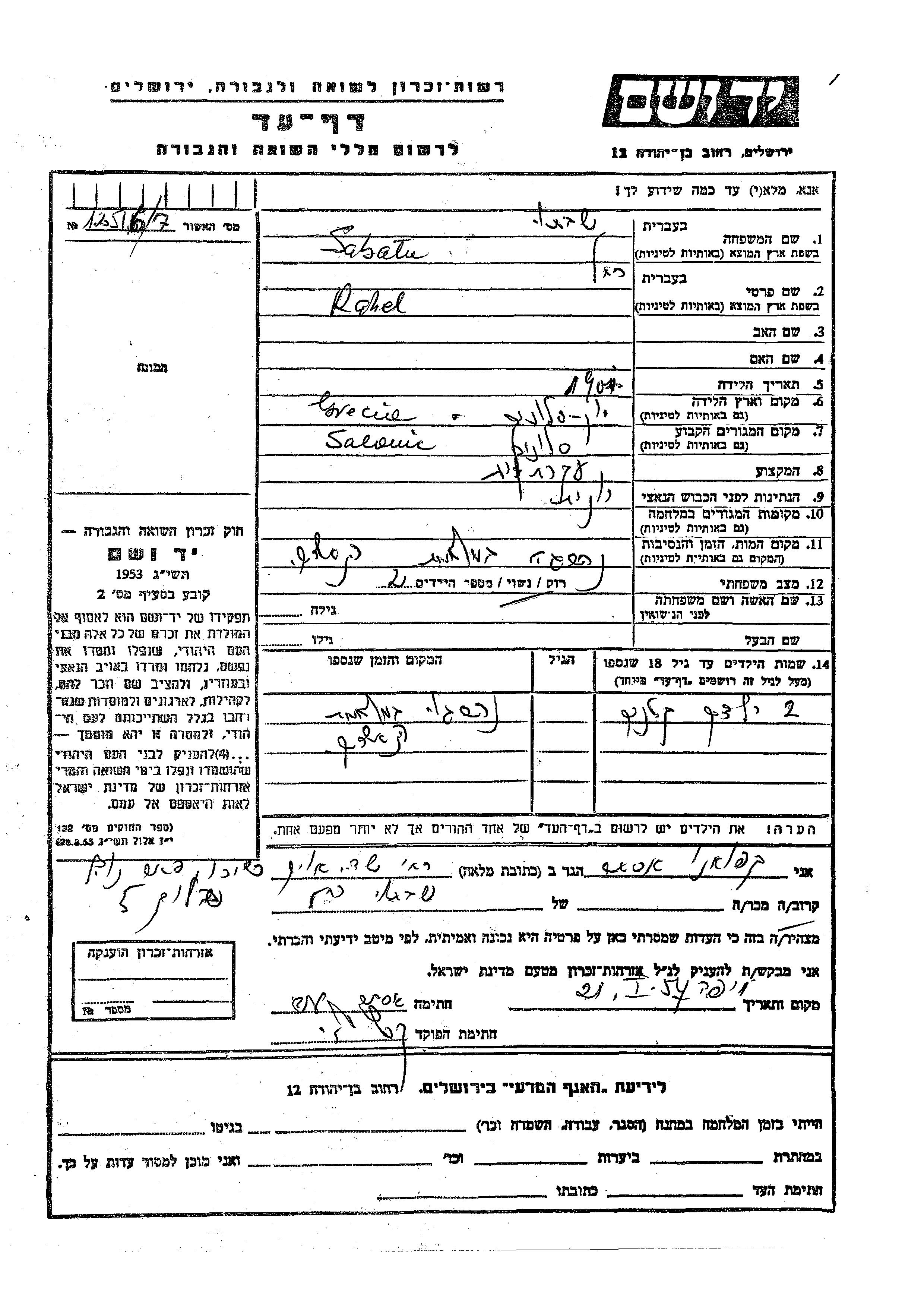 Rachel Sabatu wurde im Jahr 1907 in Salonika, Griechenland geboren. Sie war Hausfrau und Verheiratet. Vor dem Zweiten Weltkrieg lebte sie in Salonika, Griechenland.