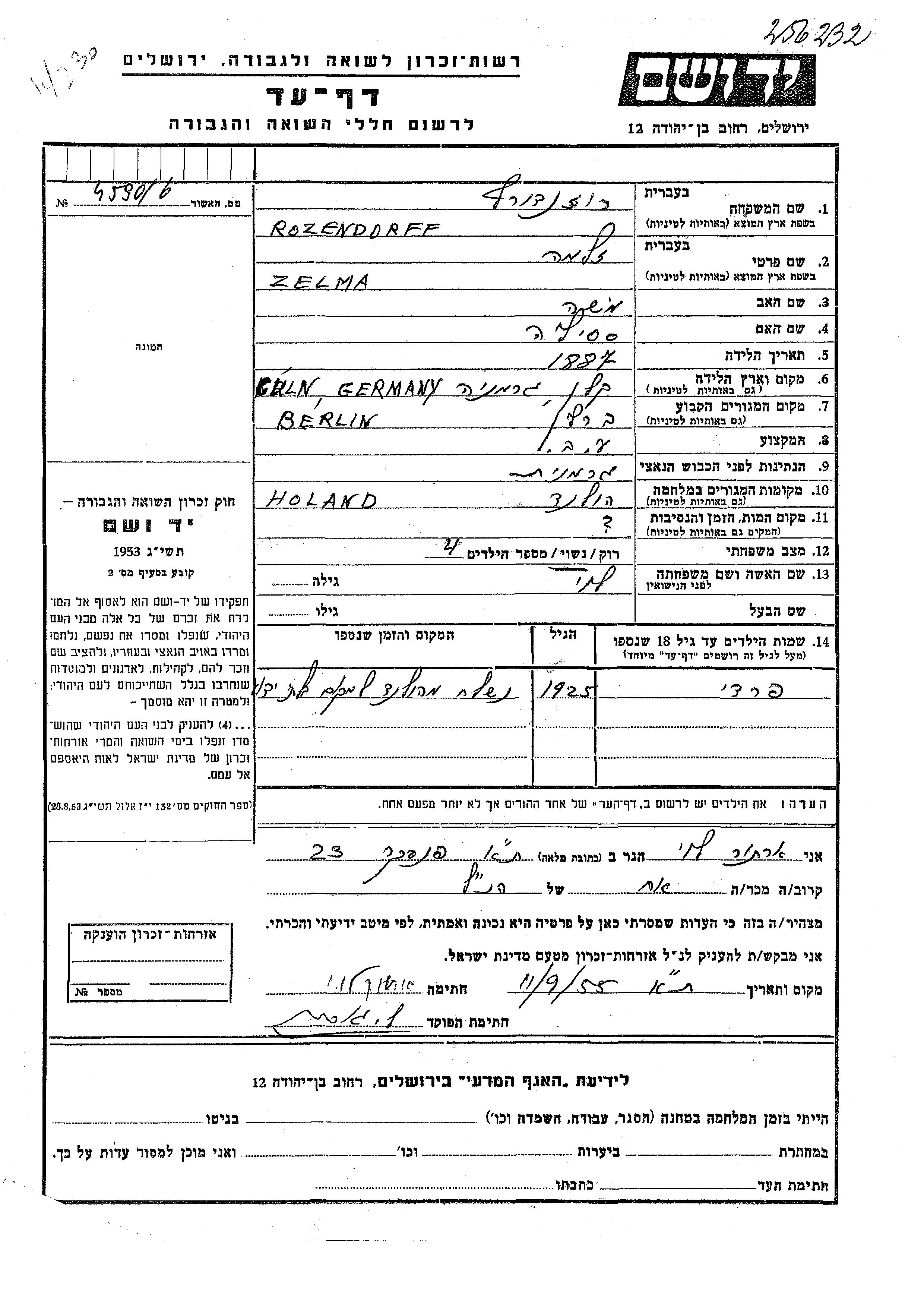 Zelma Rozendorff, geb. Levi wurde im Jahr 1887 in Keln, Deutsches Reich geboren. Sie war die Tochter von Moshe und Sesilia. Sie war Hausfrau und Verheiratet. Vor dem Zweiten Weltkrieg lebte sie in Berlin, Deutsches Reich. Während des Krieges war sie in Niederlande.