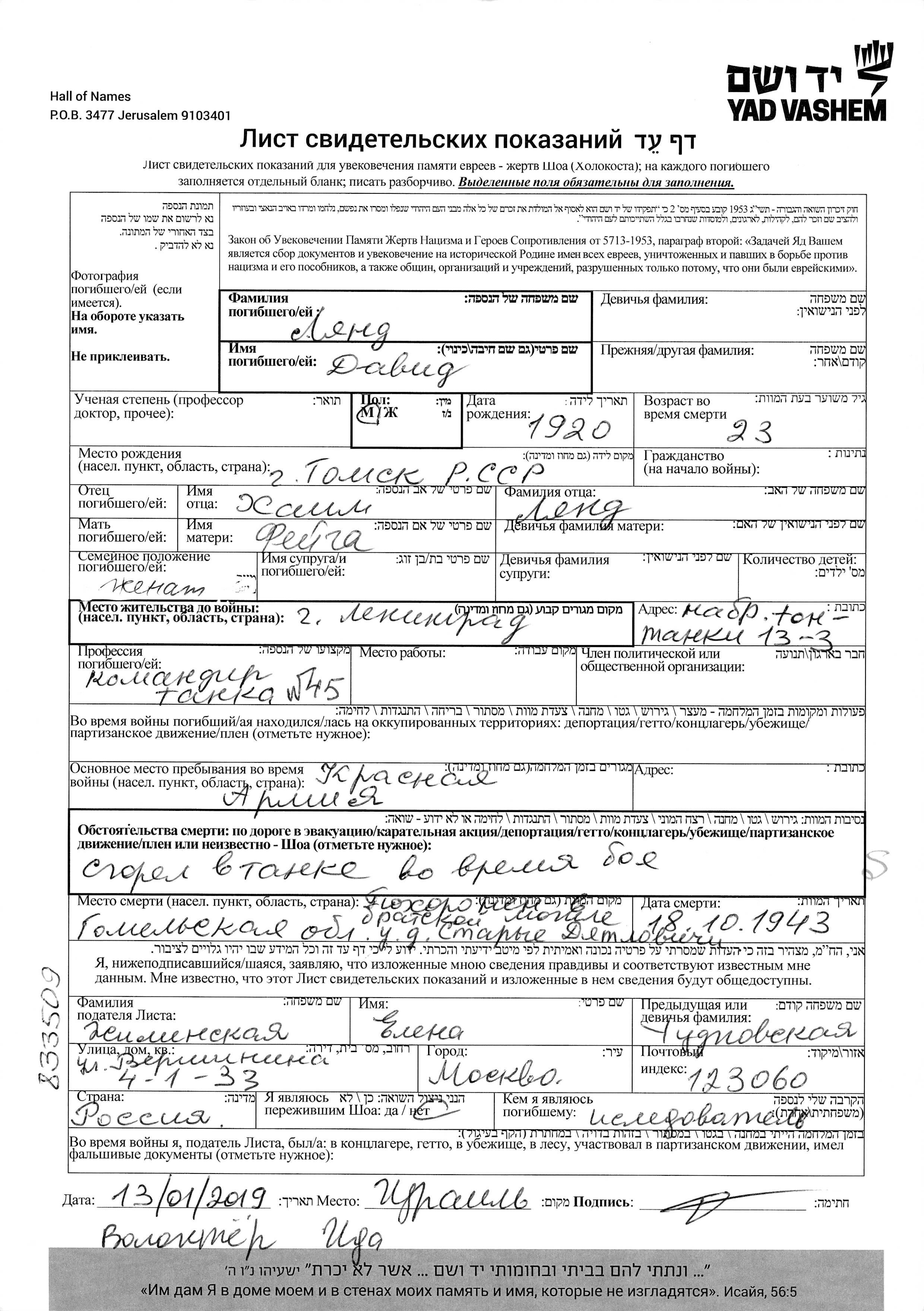 David Lyand wurde im Jahr 1920 in Tomsk, Russland (UdSSR) geboren. Er war der Sohn von Khaim und Feyga. Er war Verheiratet. Vor dem Zweiten Weltkrieg lebte er in Leningrad, Russland (UdSSR). Während des Krieges war er in die Sowjetischen Streitkräfte. David im Militärdienst umgekommen. Todesort: Gomel, Weißrussland (UdSSR) im Jahr 18/10/1943.