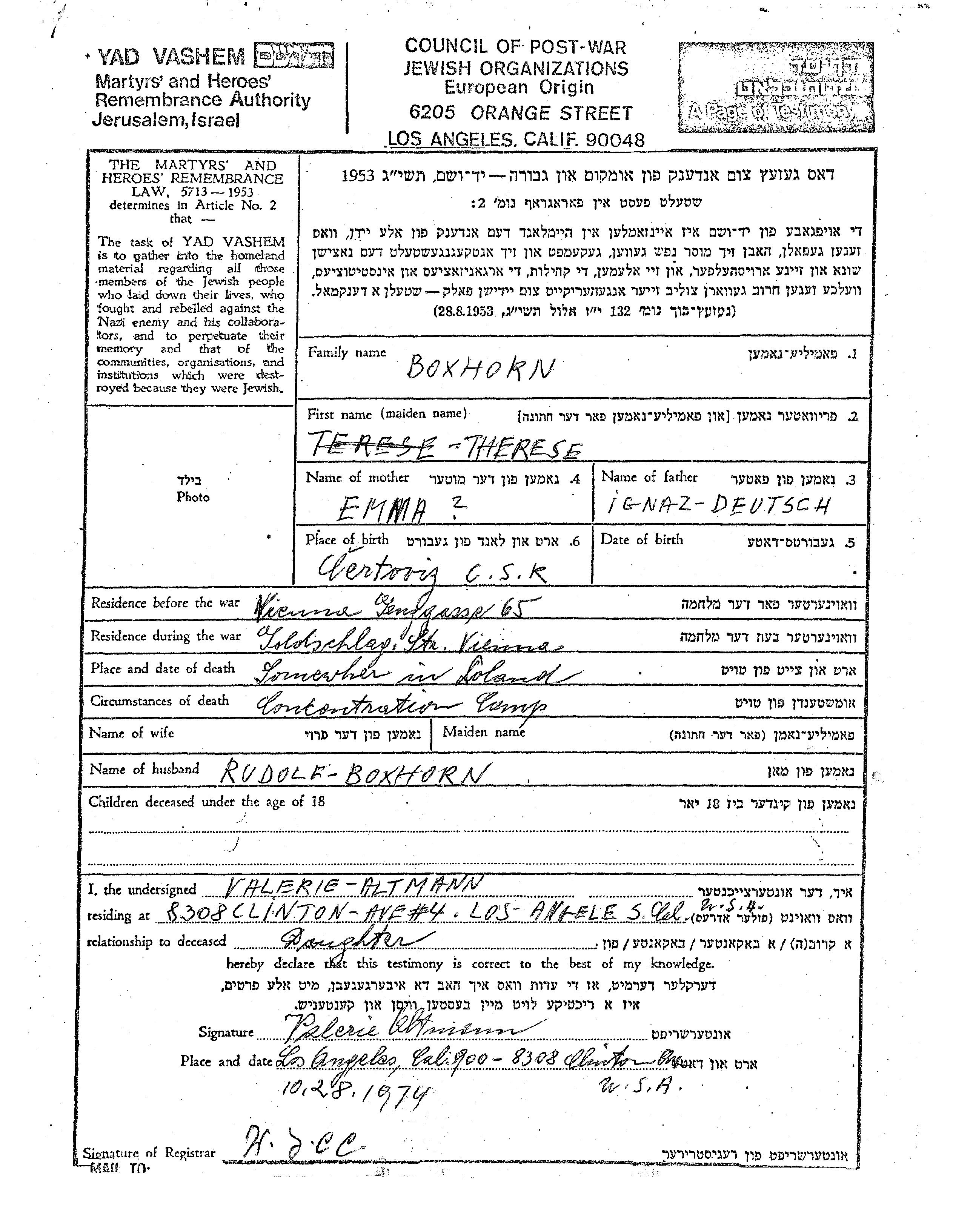 Therese Boxhorn, geb. Deutsch wurde in Tschechoslowakei geboren. Vor dem Zweiten Weltkrieg lebte sie in Vienna, Österreich.