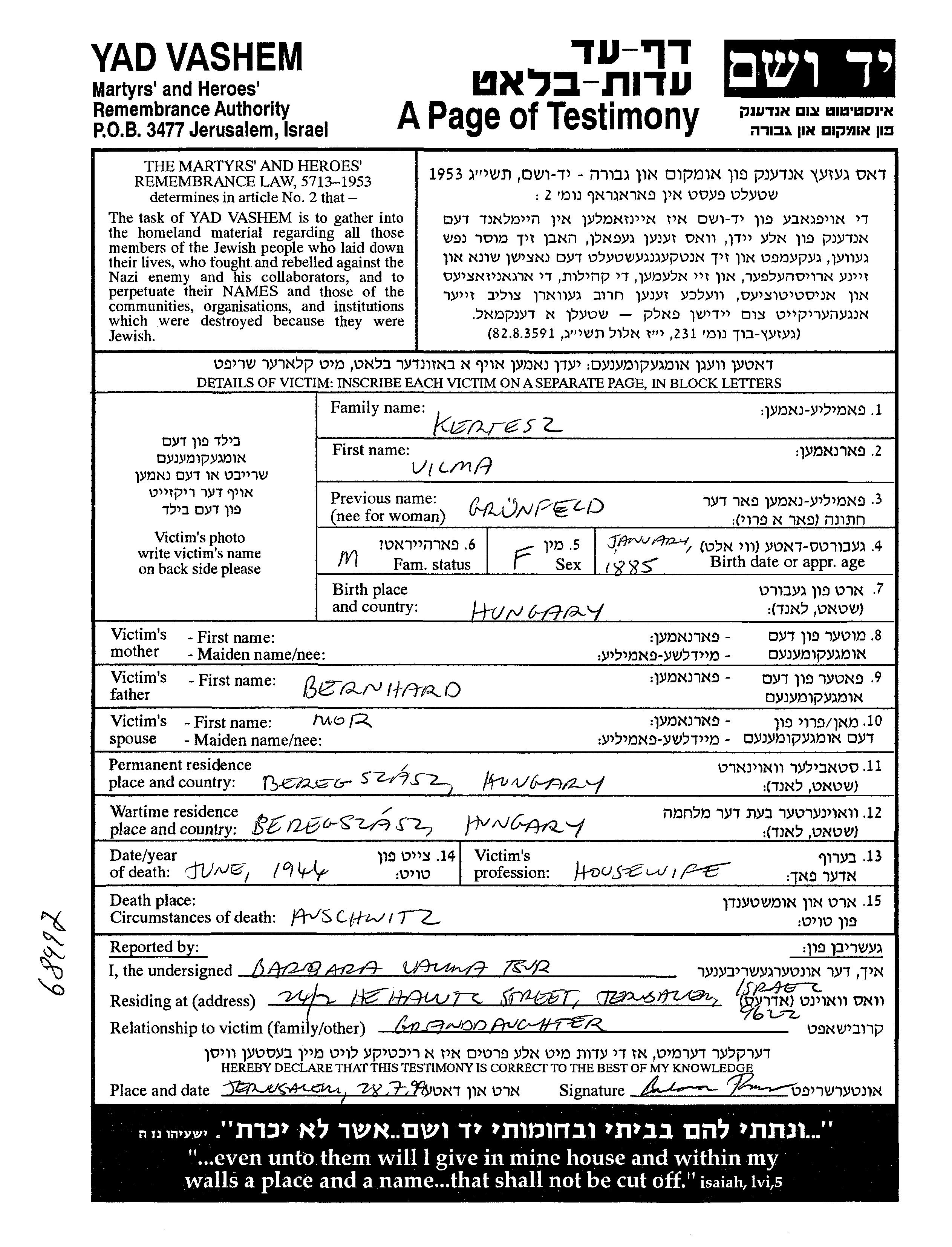 Vilma wurde in der Schoah ermordet. Todesort: Auschwitz, Polen im Jahr 1944.