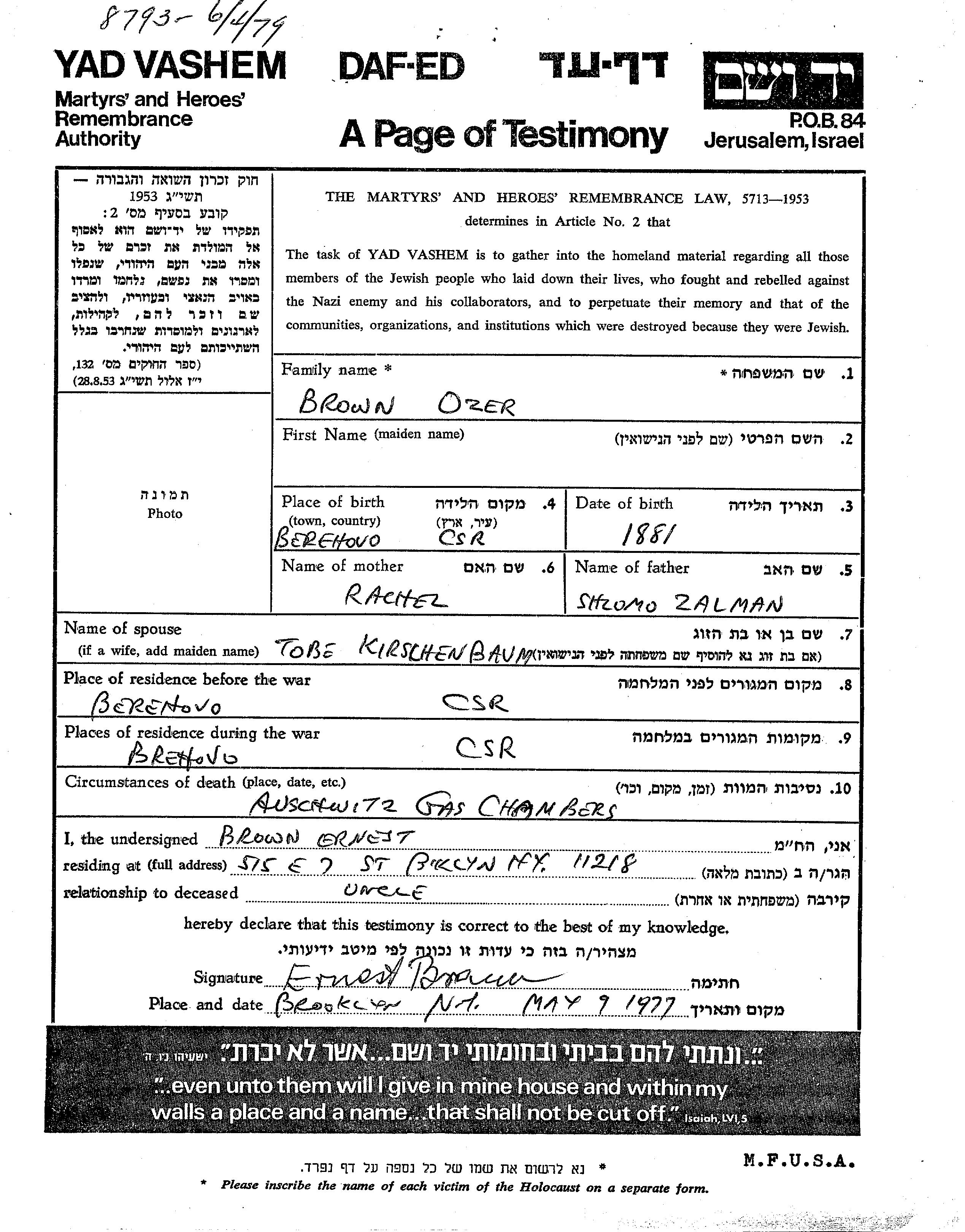 Ozer Brown wurde im Jahr 1881 in Berehovo, Tschechoslowakei geboren. Er war der Sohn von Shlomo Zalman und Rachel. Er war mit Tobe, geb. Kirschenbaum Verheiratet. Vor dem Zweiten Weltkrieg lebte er in Berehovo, Tschechoslowakei. Während des Krieges war er in Berehovo, Tschechoslowakei.