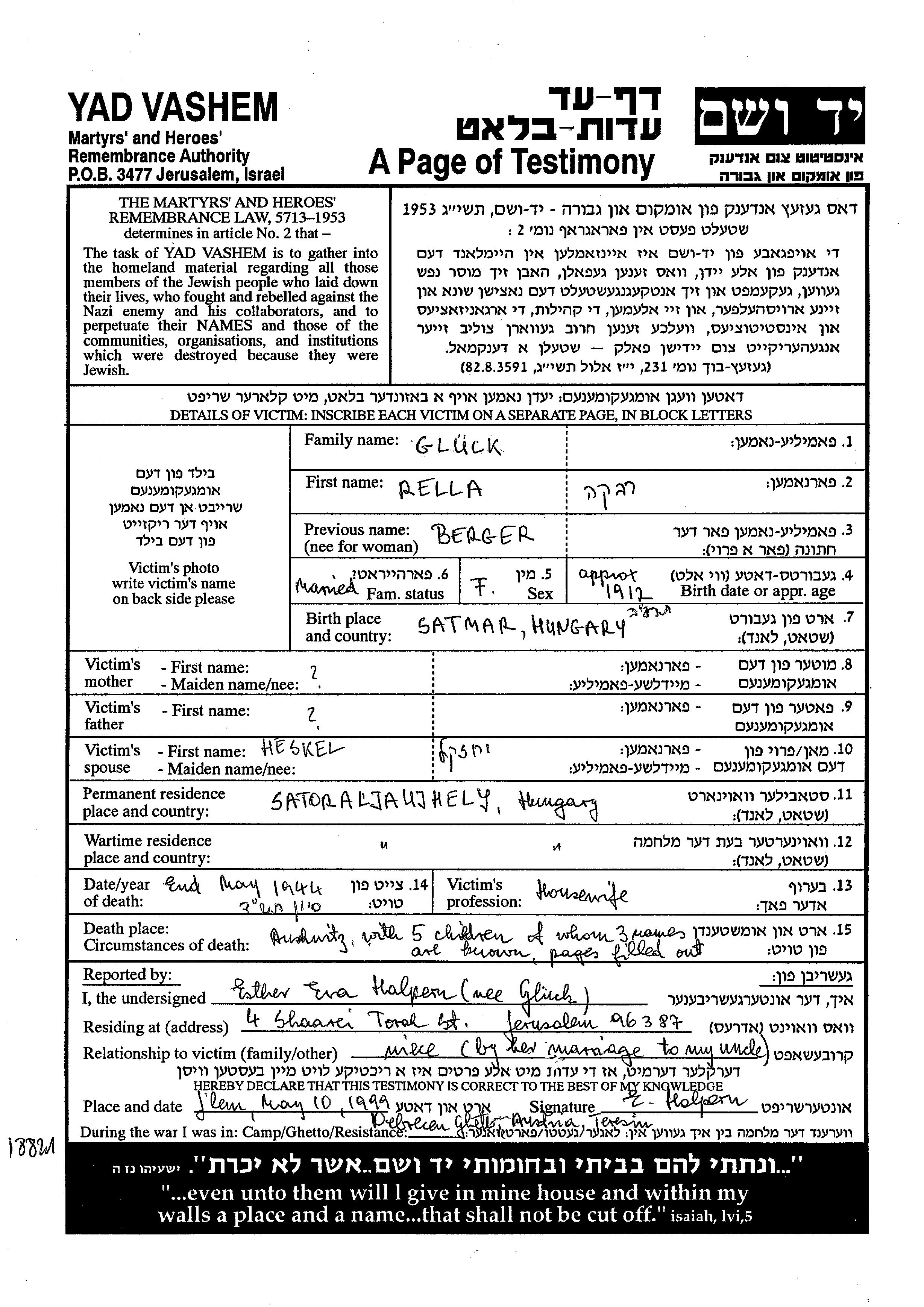 Glik Rivka Rela 1910 Debrecen, Ungarn Gedenkblatt