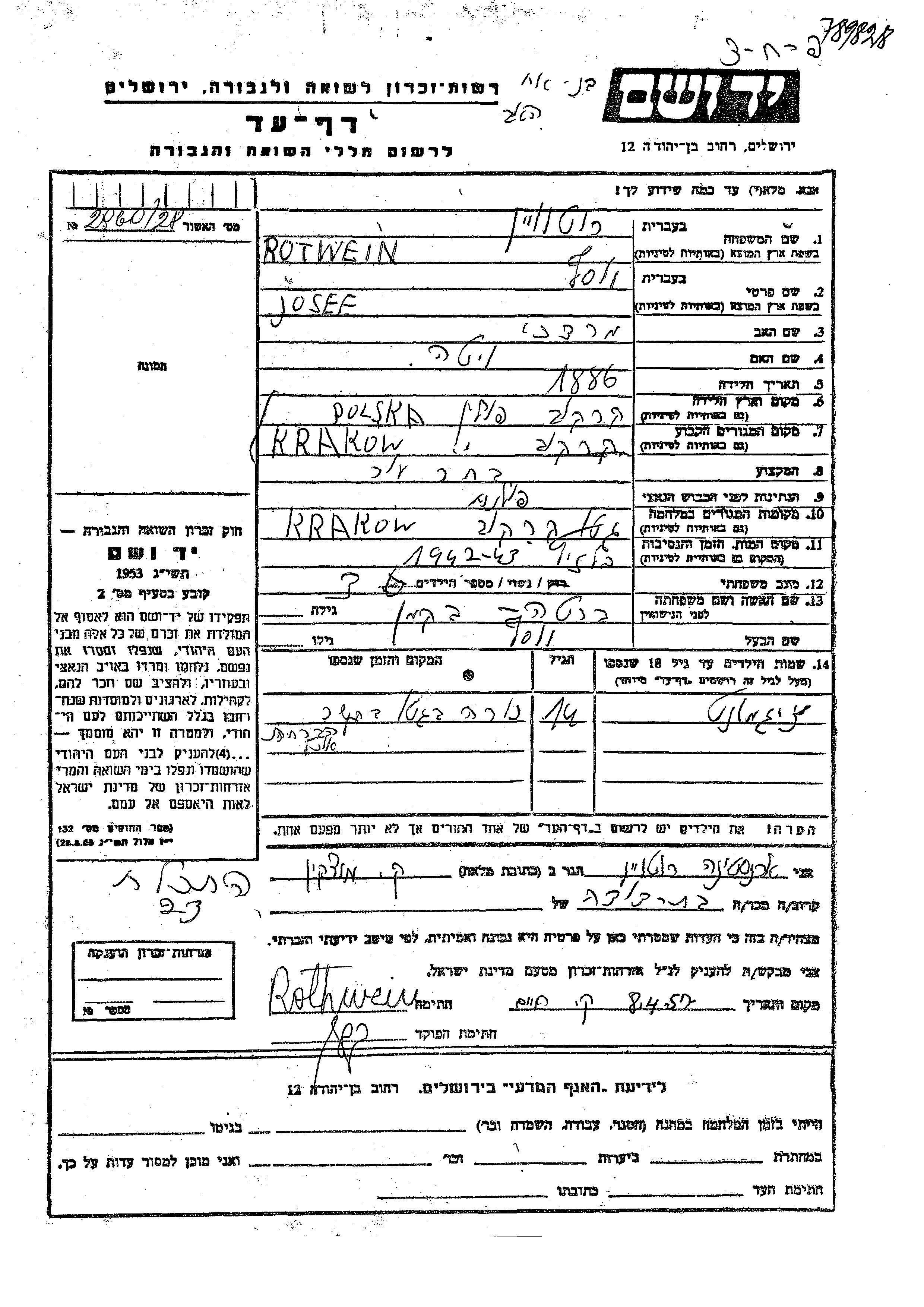 Josef Rotwein wurde im Jahr 1886 in Krakow, Polen geboren. Er war der Sohn von Mordekhai und Vita. Er war mit Berta, geb. Bekman Verheiratet. Vor dem Zweiten Weltkrieg lebte er in Krakow, Polen. Während des Krieges war er in Krakow, Polen.