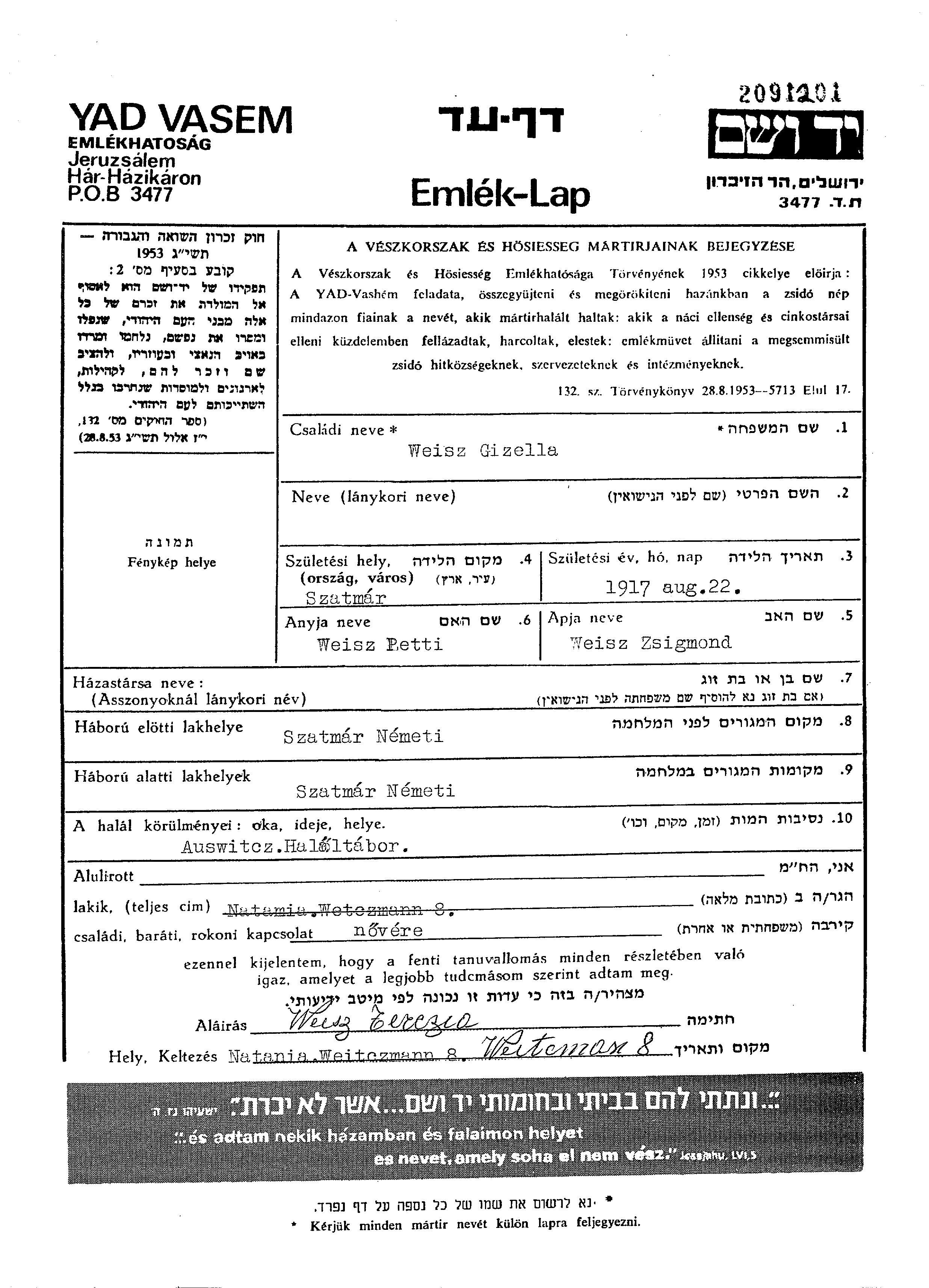 Gizella Weisz wurde im Jahr 1917 in Satu Mare, Rumänien geboren. Sie war Schneiderin. Vor dem Zweiten Weltkrieg lebte sie in Satu Mare, Rumänien.