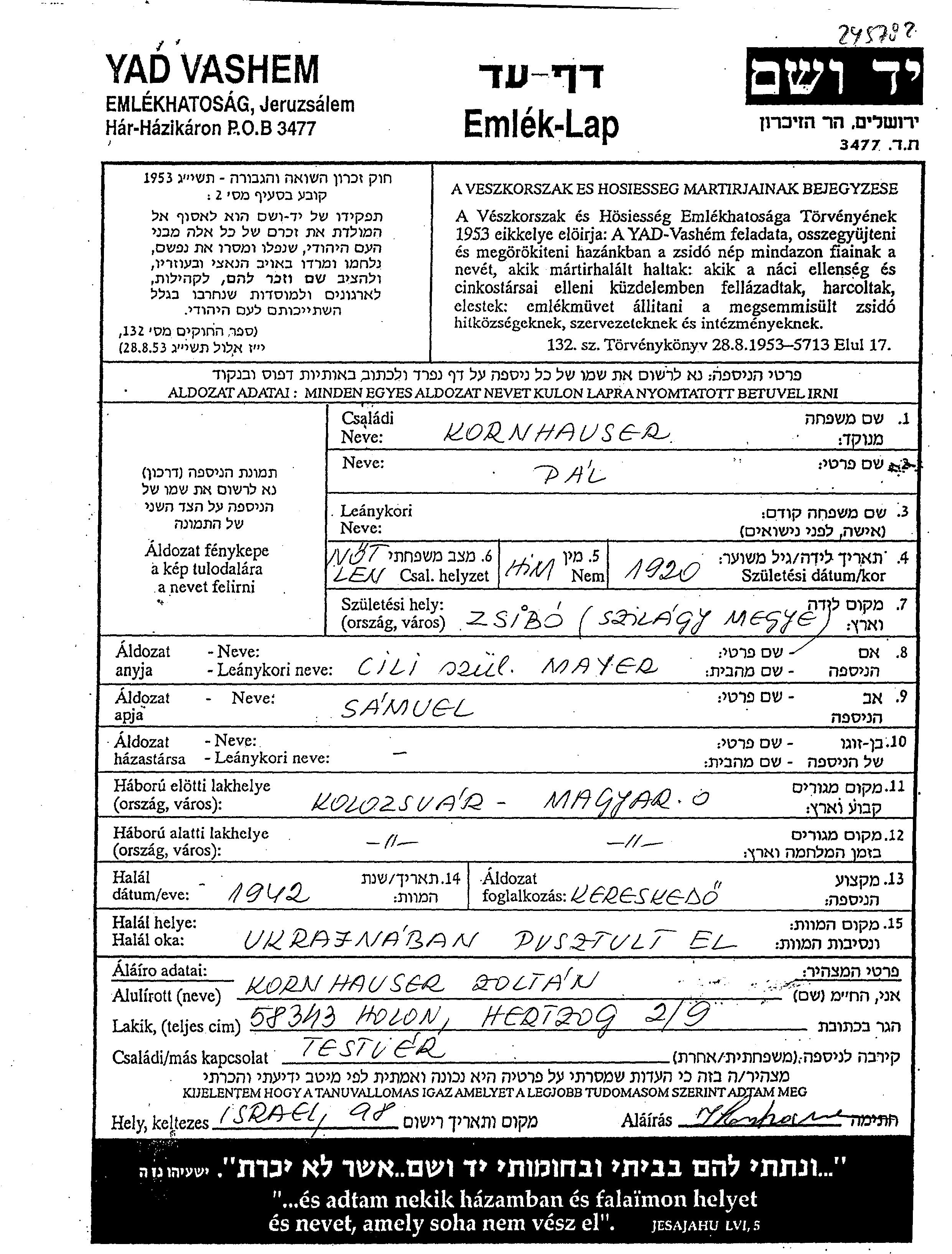 Pal Kornhauser wurde im Jahr 1920 in Zsibo, Rumänien geboren. Vor dem Zweiten Weltkrieg lebte er in Kolozsvar, Rumänien.