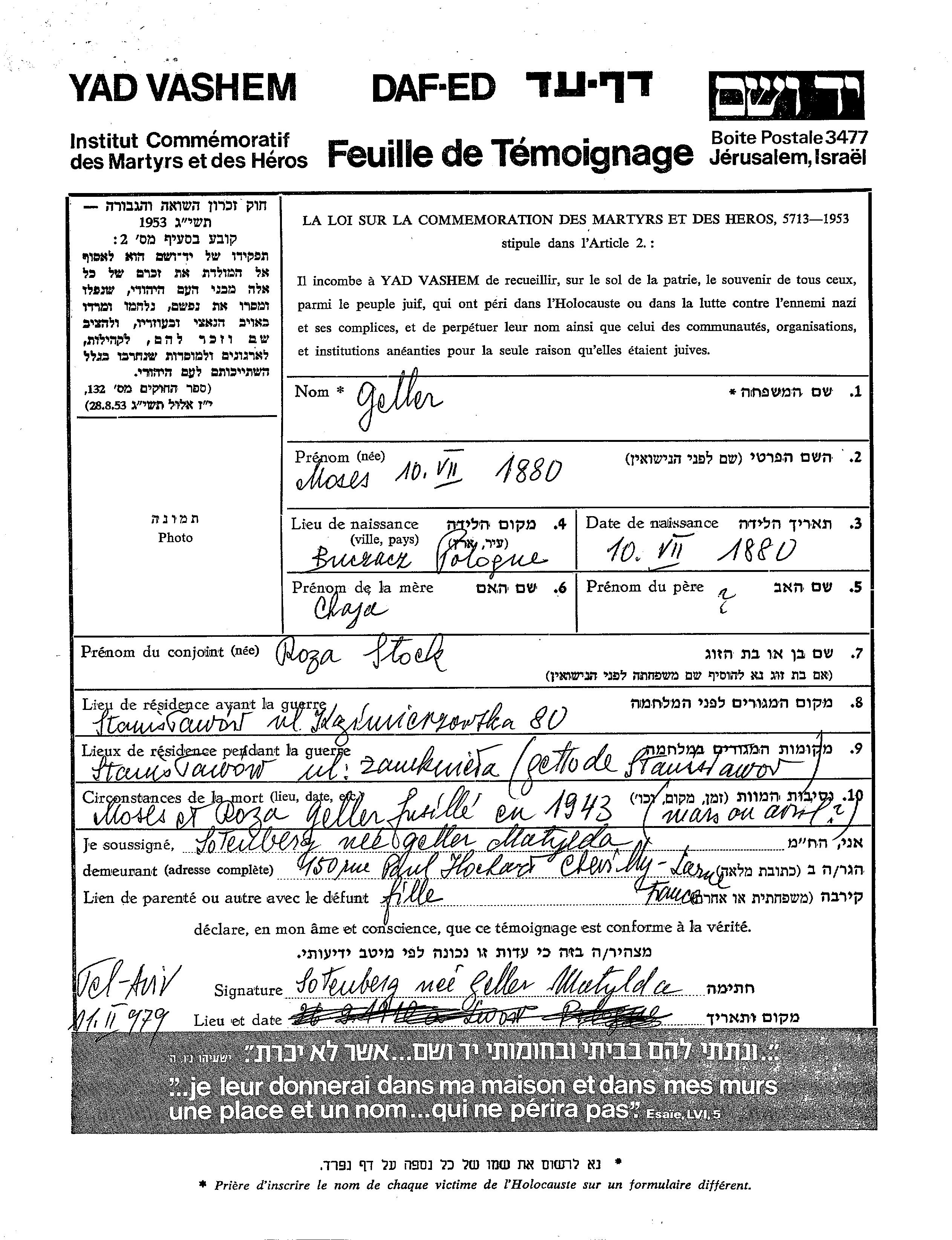 Moses Geller wurde im Jahr 1880 in Buczacz, Polen geboren. Er war der Sohn von Chaja. Er war mit Roza, geb. Stock Verheiratet. Vor dem Zweiten Weltkrieg lebte er in Stanislawow, Polen. Während des Krieges war er in Stanislawow, Polen.