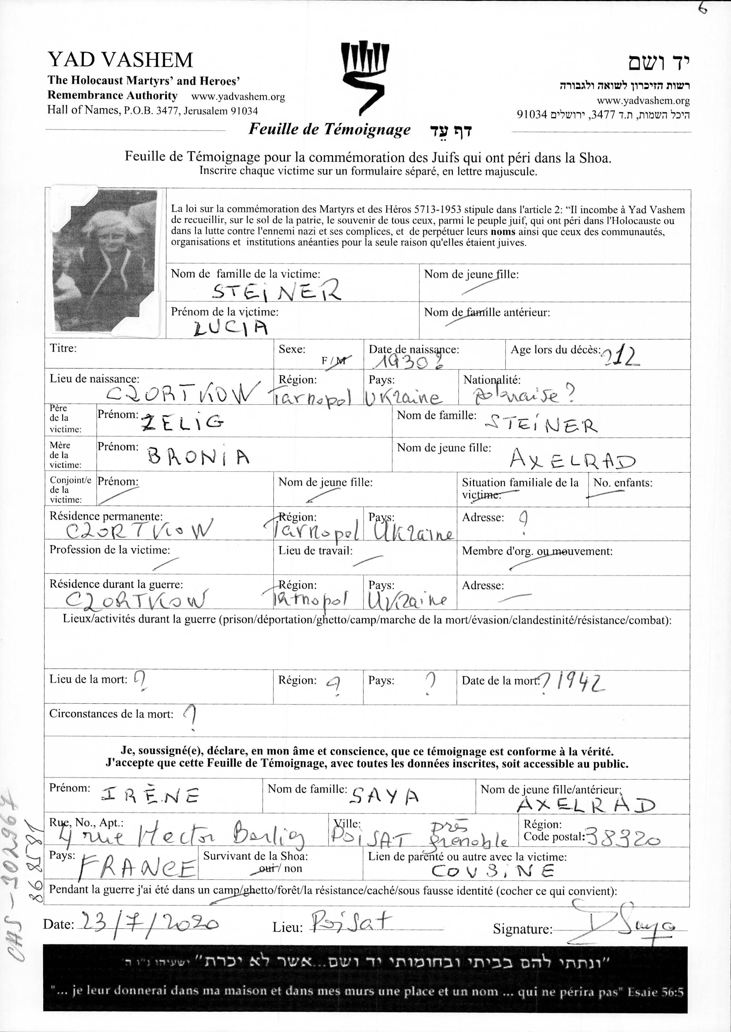 Lucia Steiner wurde im Jahr 1930 in Czortkow, Polen geboren. Vor dem Zweiten Weltkrieg lebte sie in Czortkow, Polen.