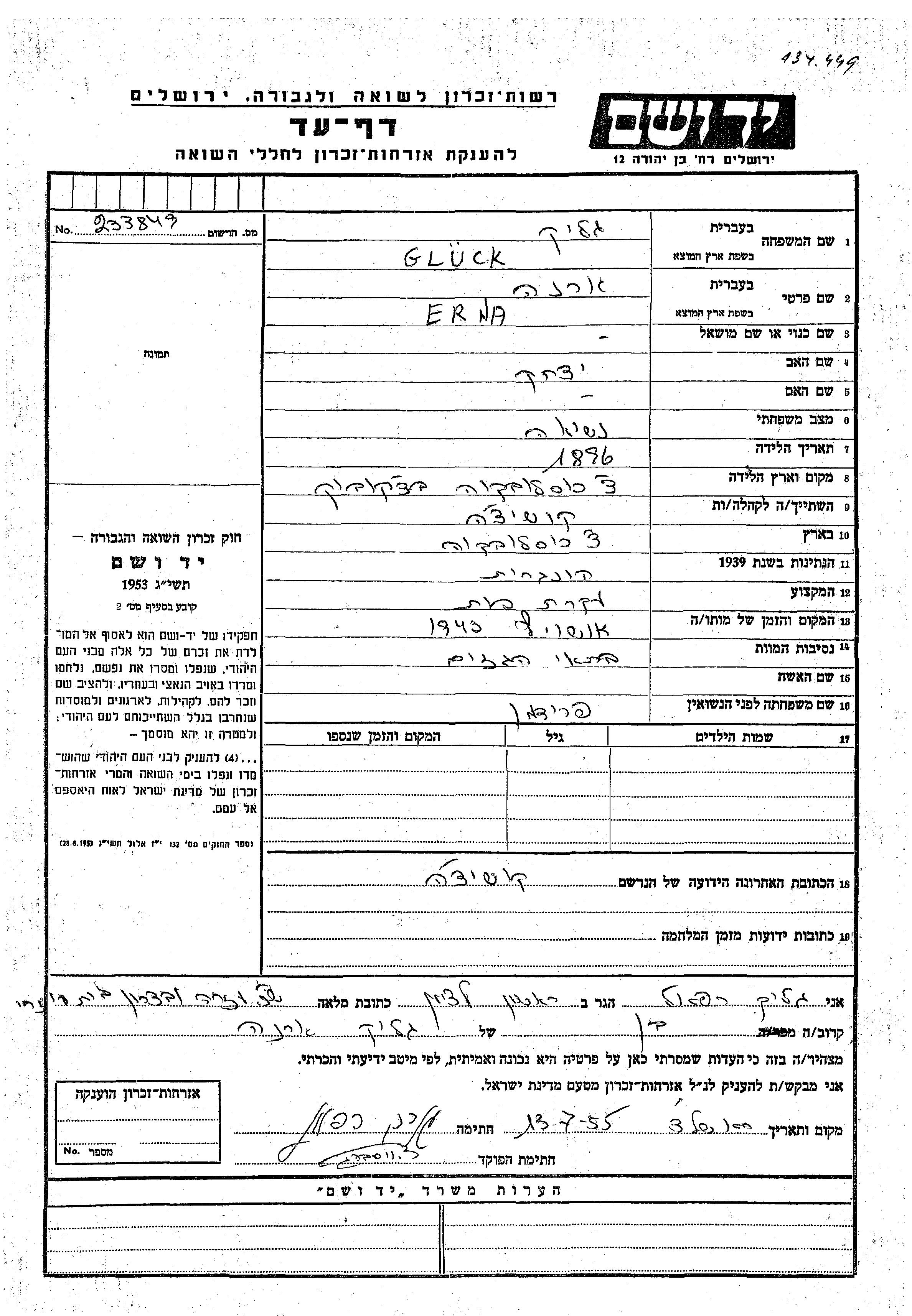 Erna Gluck, geb. Fridman wurde im Jahr 1896 in Backovik, Tschechoslowakei geboren. Sie war die Tochter von Yitzkhak. Sie war Hausfrau und Verheiratet. Vor dem Zweiten Weltkrieg lebte sie in Kosice, Tschechoslowakei. Während des Krieges war sie in Kosice, Tschechoslowakei.