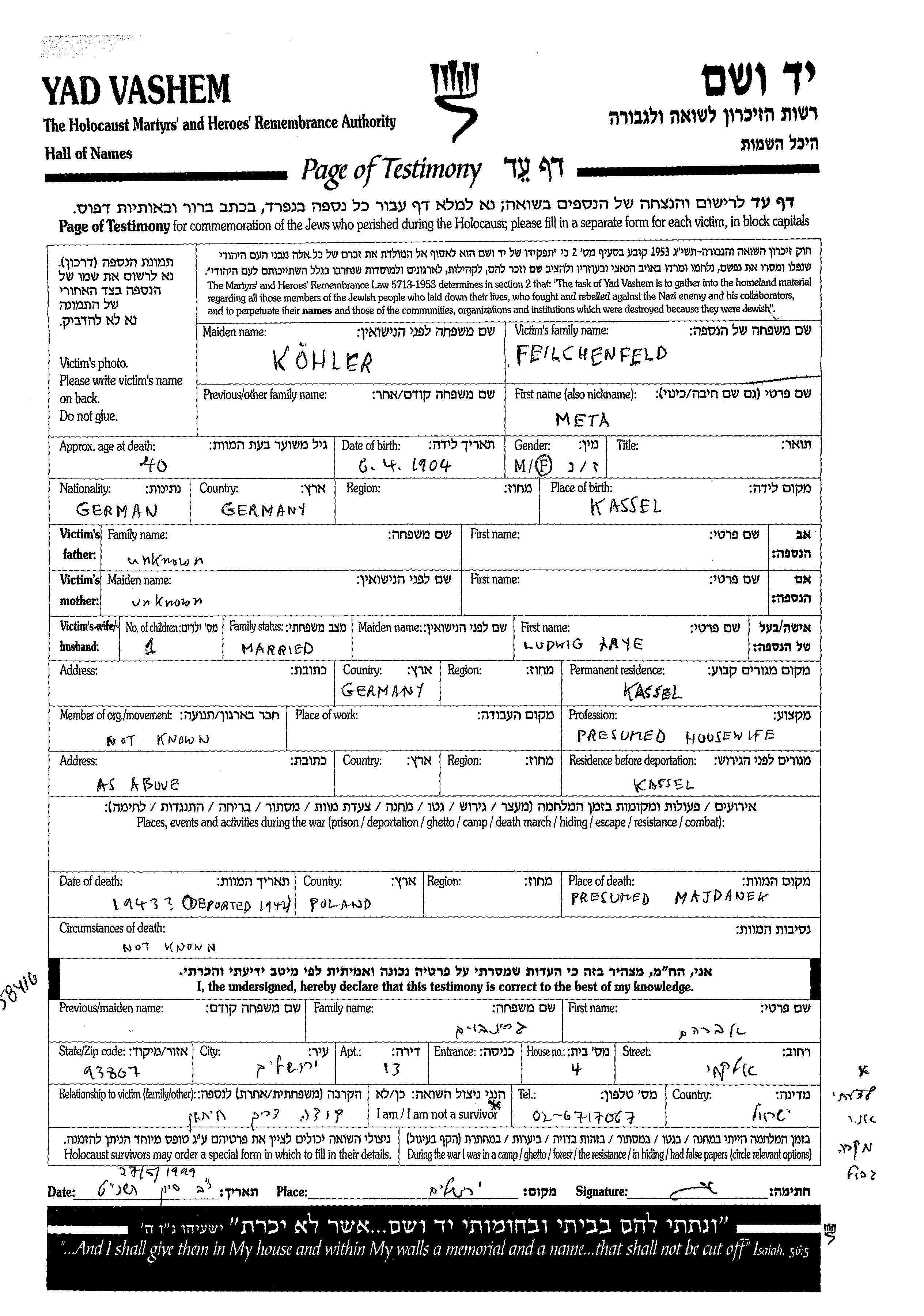 | Feilchenfeld | Meta Miriam | 06/04/1904 | Kassel, Deutsches Reich | Photos |