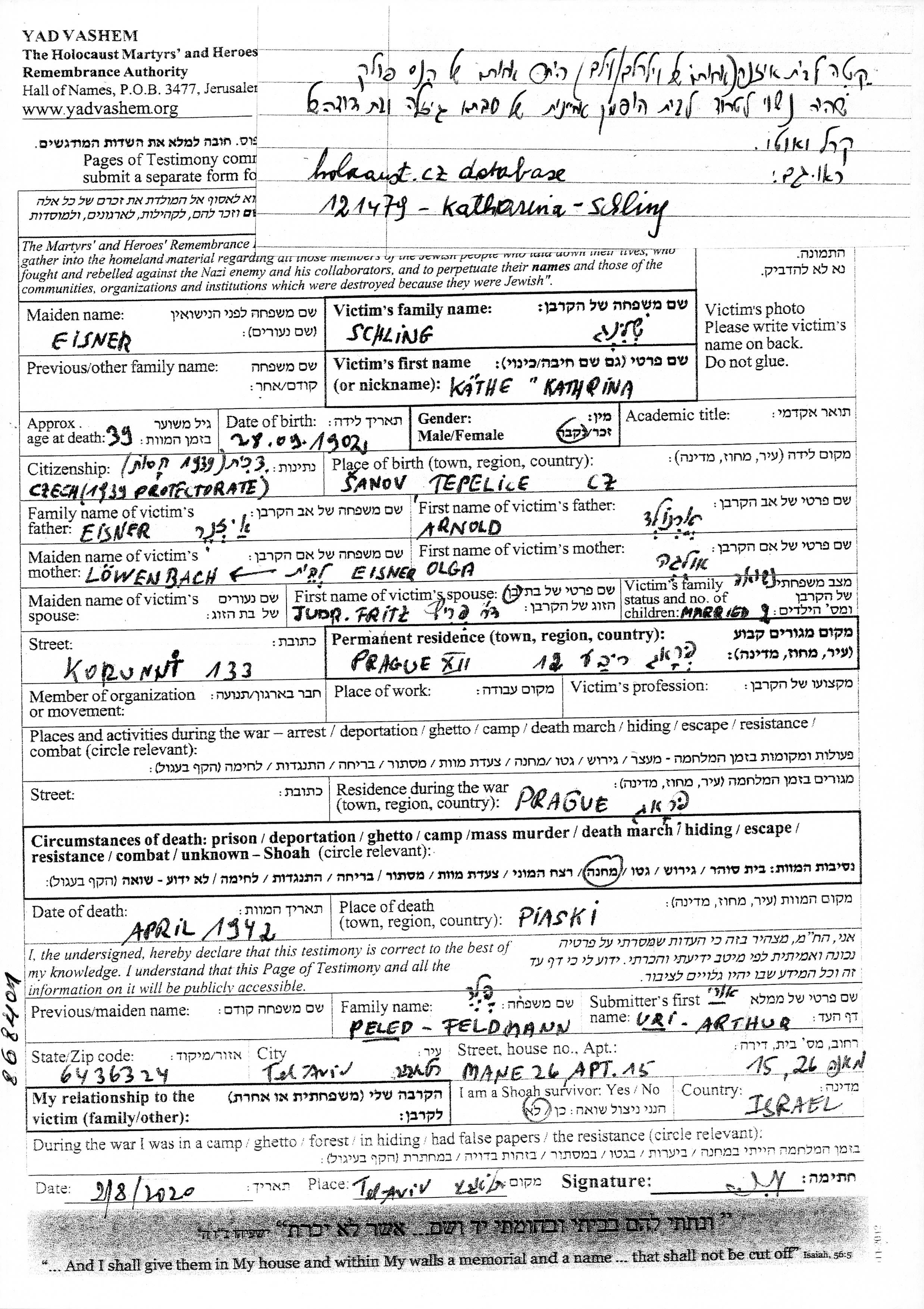 Käthe Schling, geb. Eisner wurde im Jahr 1902 in Sanov, Tschechoslowakei geboren. Sie war die Tochter von Arnold und Olga, geb. Löwenbach. Sie war mit Fritz Verheiratet. Vor dem Zweiten Weltkrieg lebte sie in Praha, Tschechoslowakei. Während des Krieges war sie in Piaski, Polen.