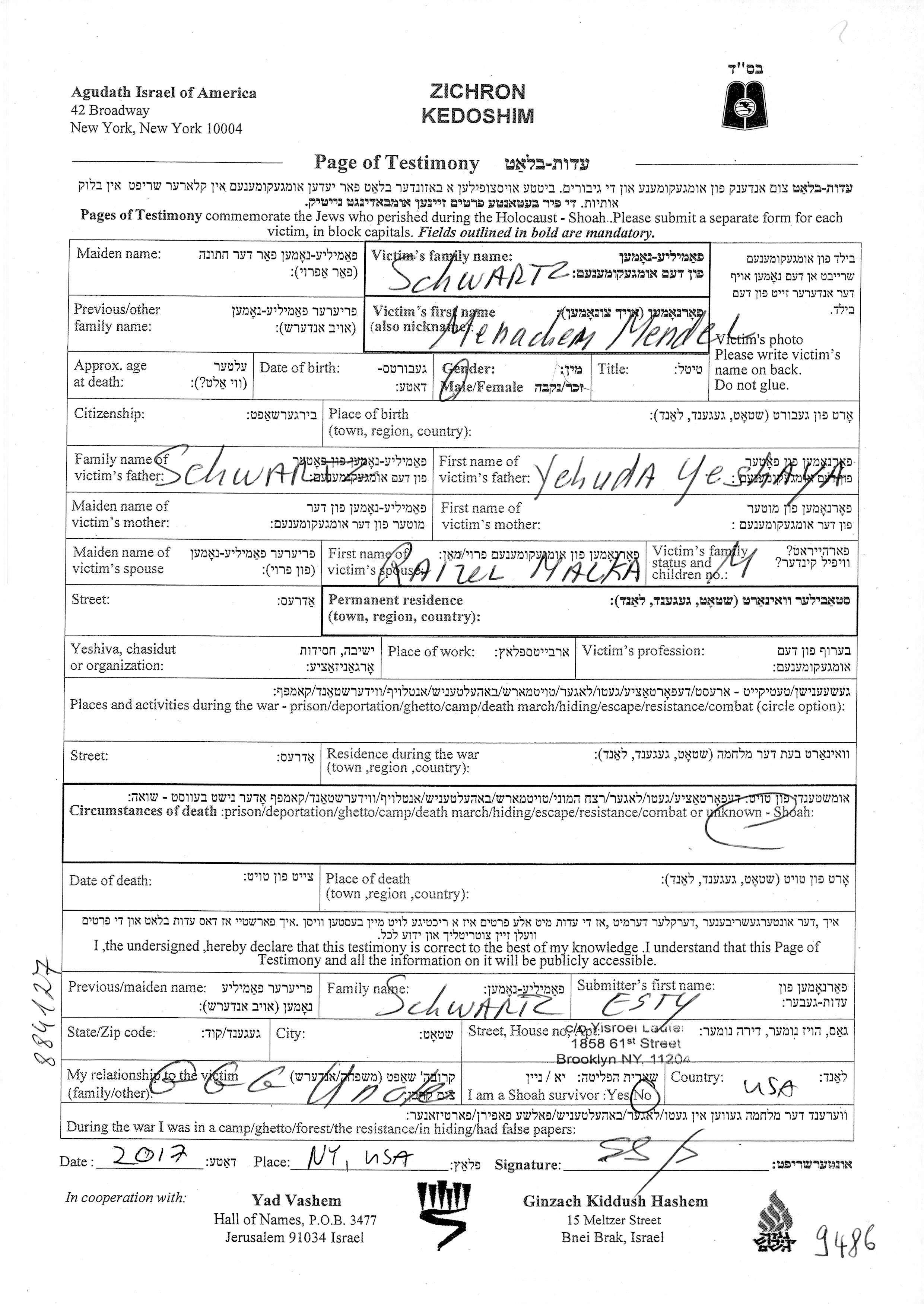 Schwartz Menachem Mendel unbekannter Ort, Gedenkblatt