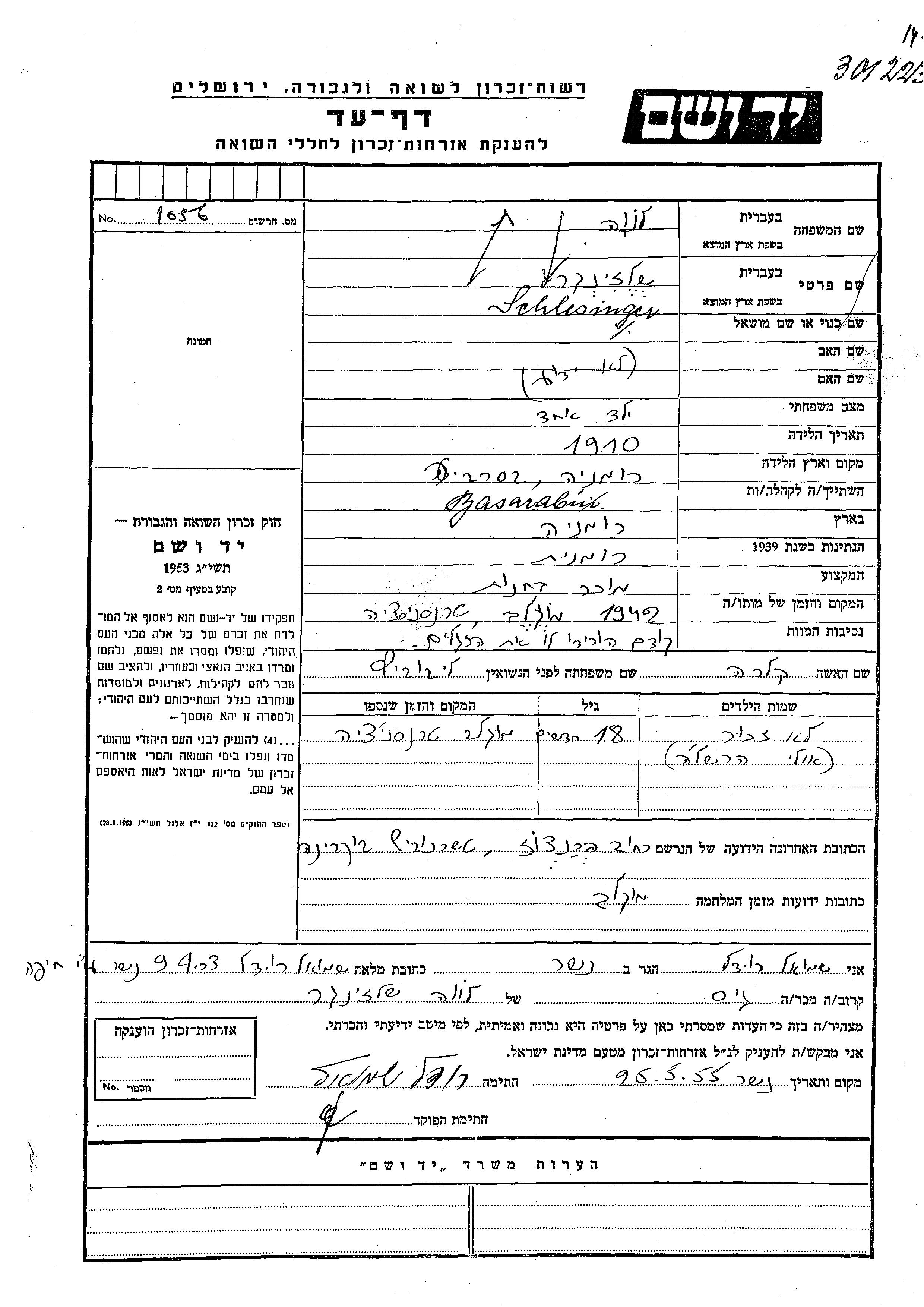 Levia Shlezinger wurde im Jahr 1910 in Rumänien geboren. Er war Verkäufer/-in und mit Klara, geb. Libovitz Verheiratet. Vor dem Zweiten Weltkrieg lebte er in Bessarabia, Rumänien. Während des Krieges war er in Czernowitz, Rumänien.